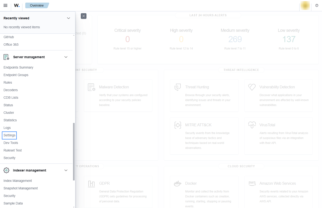 Access the Wazuh configuration in Server management > Settings using the Wazuh dashboard or by manually editing the
