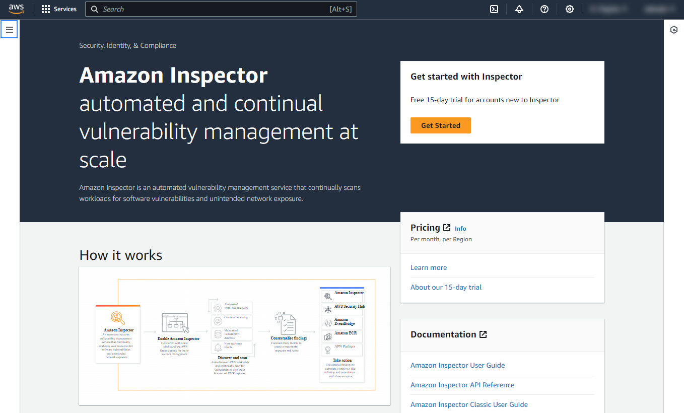 Open the Amazon Inspector page in the AWS Management Console.