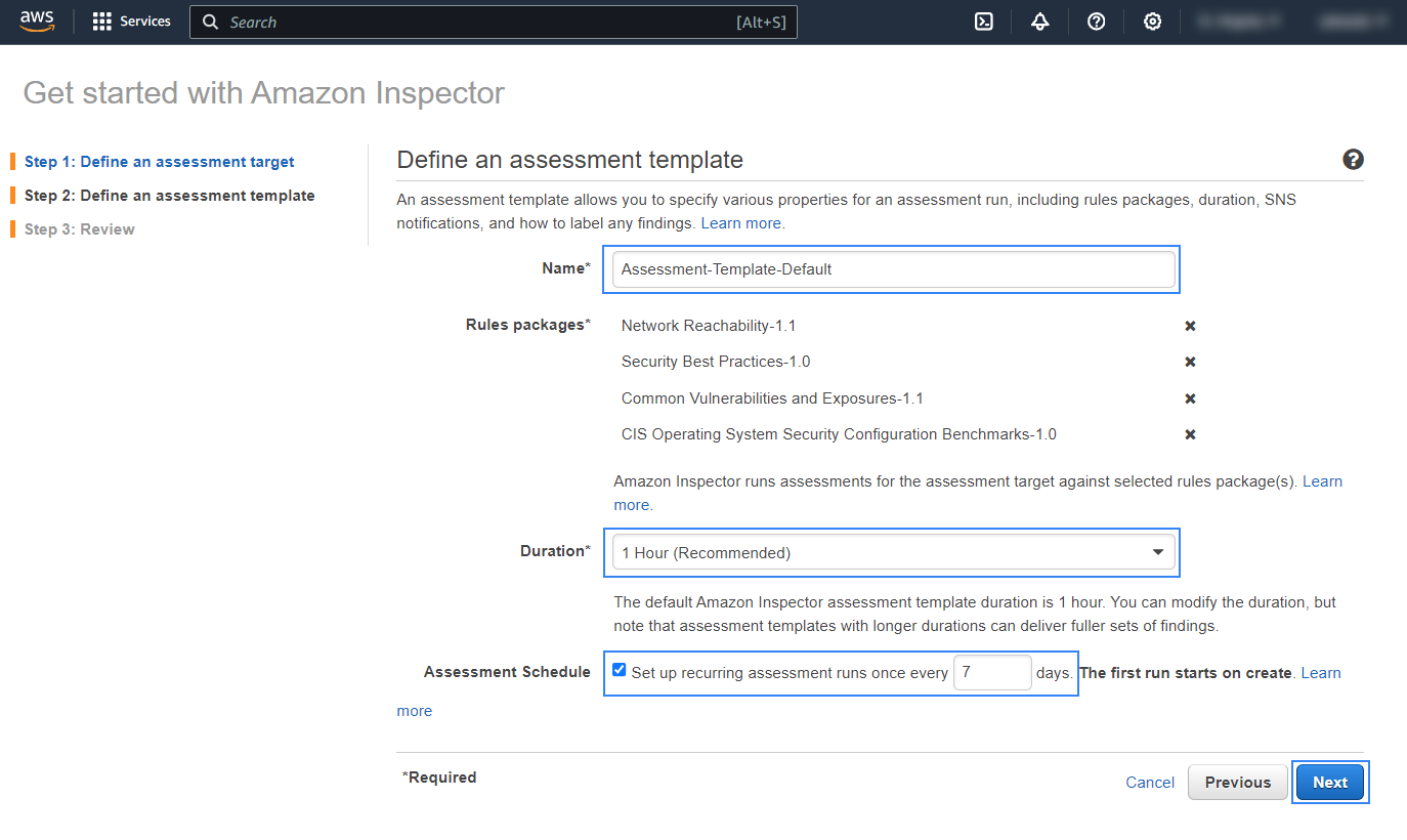 Configure the assessment template. Choose the name, duration, and frequency of the analysis and click on Next.