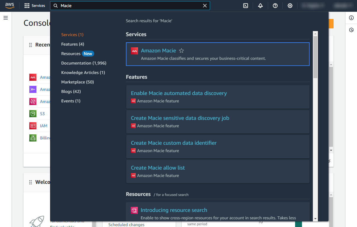 On your AWS console, search for "Amazon Macie" in the search bar and click Amazon Macie from the results.