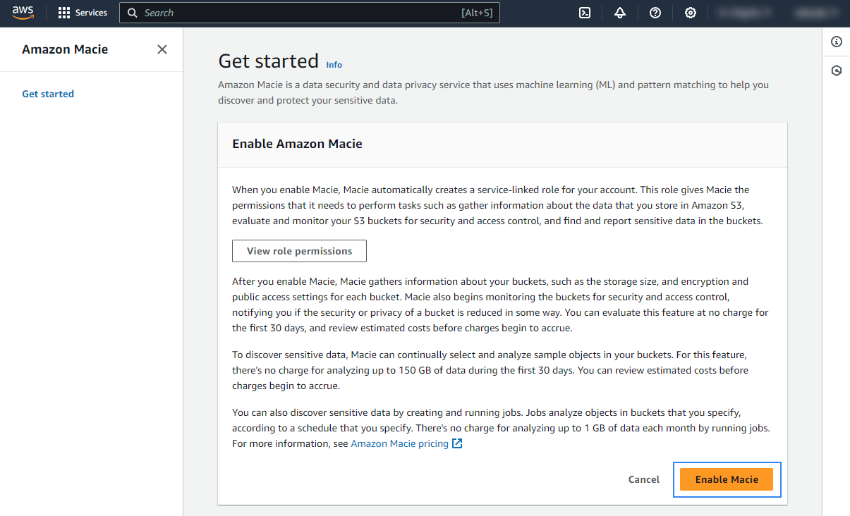 Click Enable Macie to enable the service.