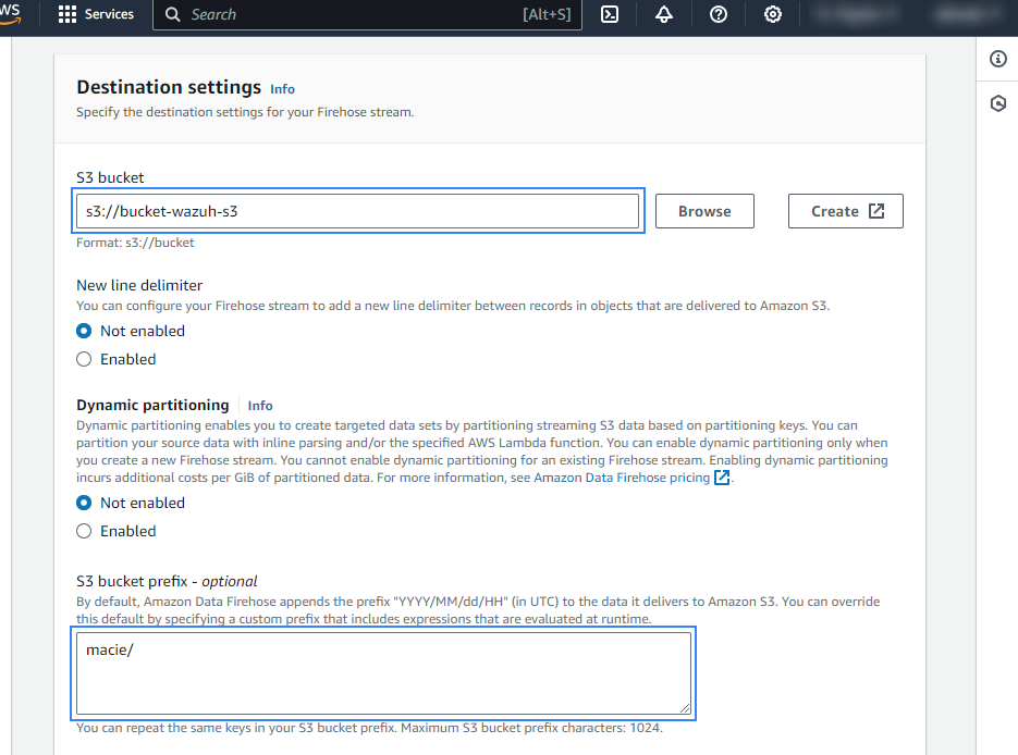 Create an Amazon Data Firehose delivery stream to store the Amazon Macie events into the desired S3 bucket so Wazuh can process them.