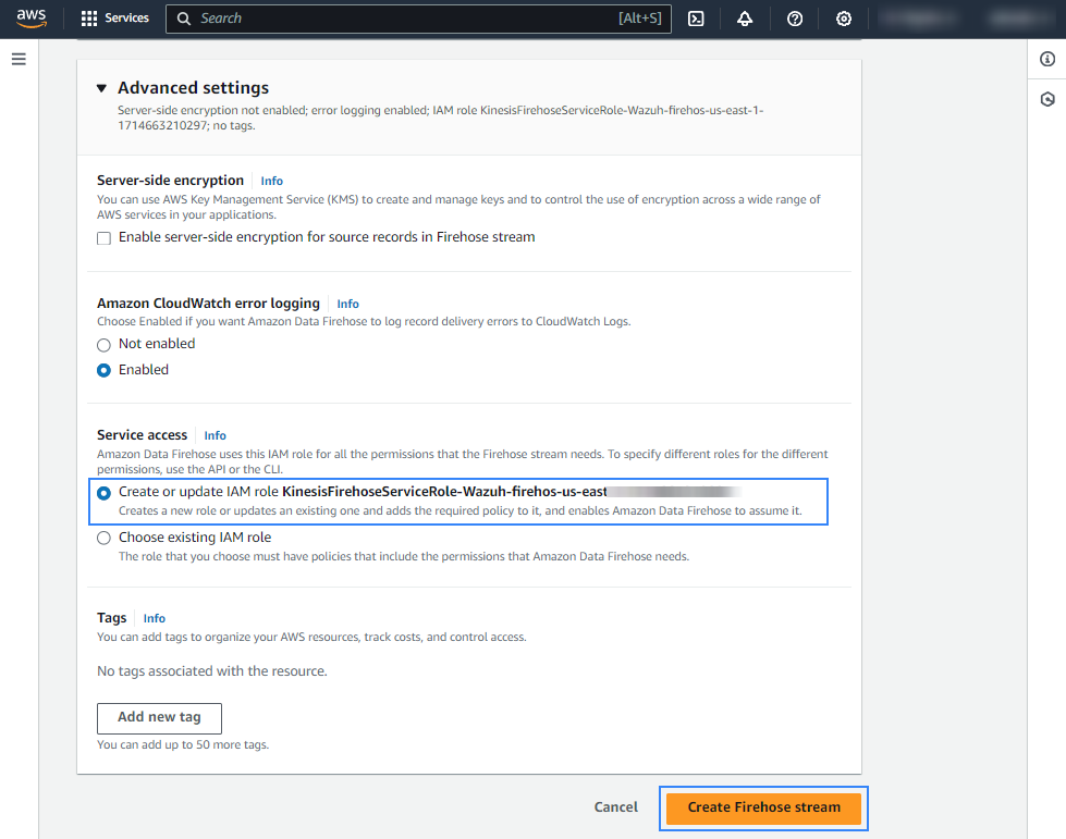Create or choose an existing IAM role to be used by Amazon Data Firehose in the Advanced settings section.