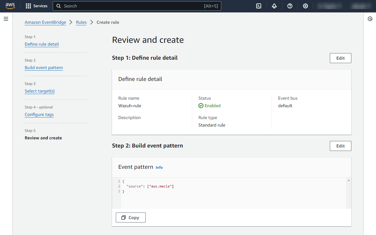 Once the rule is created, every time a Macie event is sent, it will be stored in the specified S3 bucket. Remember to first enable the Macie service, otherwise, you won't get any data.