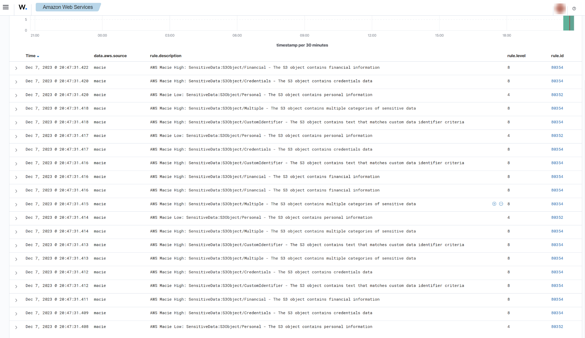 When sensitive data such as financial information, credentials, and personal information are found in an S3 bucket, the following alerts with rule ID 80352 and 80354 will be displayed on the Wazuh dashboard.