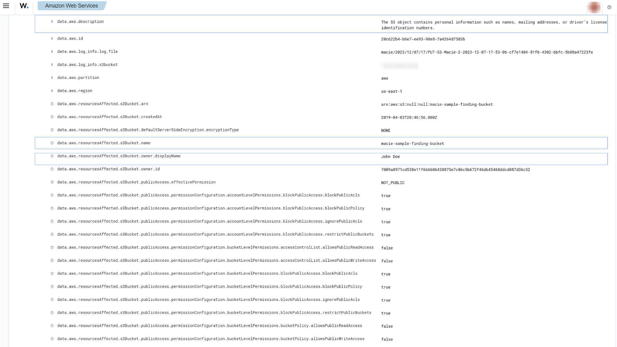 You can expand the alert to see more information such as the description of the alert, and details about the affected S3 bucket.
