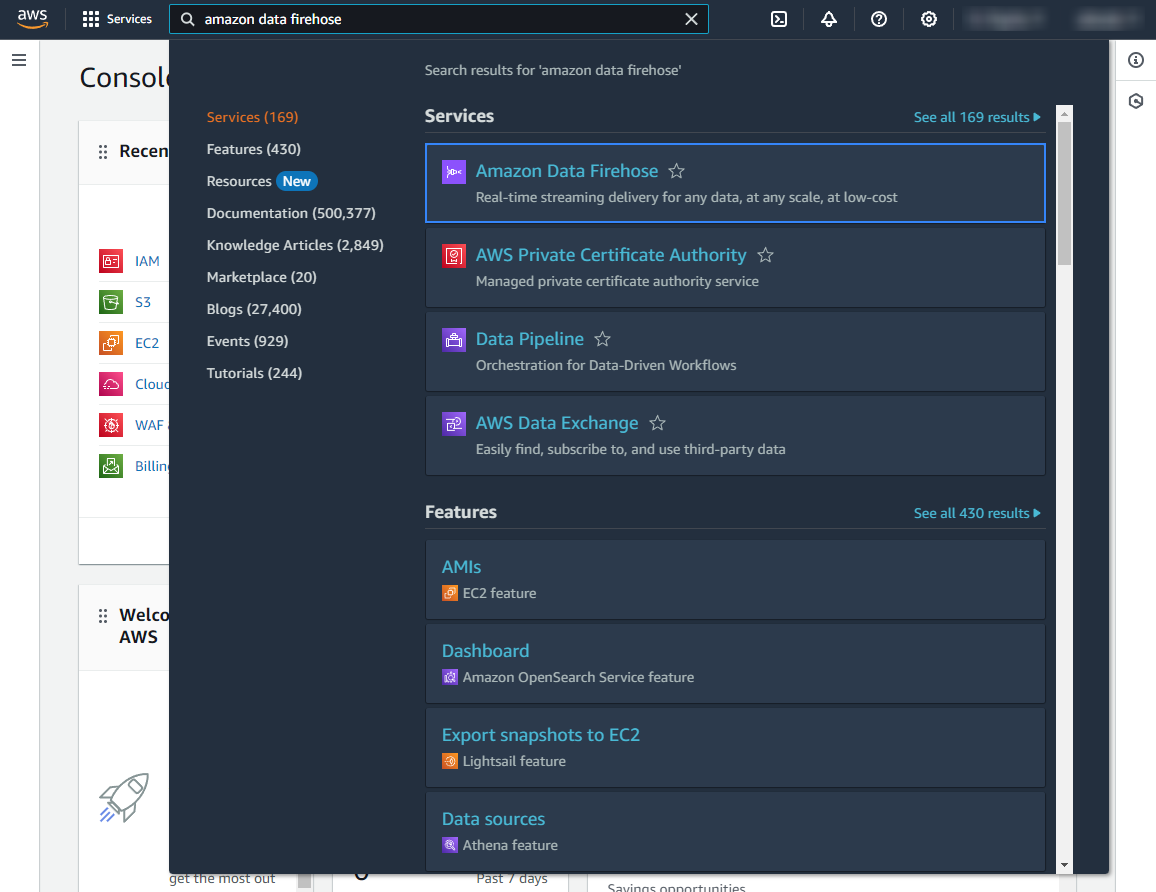 On your AWS console, Search for "amazon data firehose" in the search bar at the top of the page or go to Services > Analytics > Amazon Data Firehose.