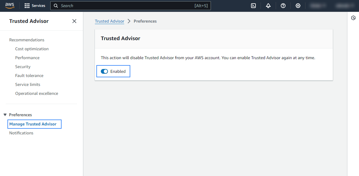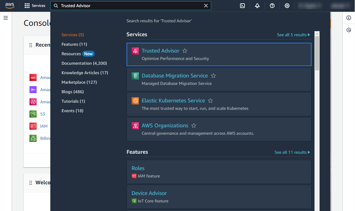 On your AWS console, search for "Trusted Advisor" in the search bar at the top of the page or navigate to Services > Management & Governance > Trusted Advisor.
