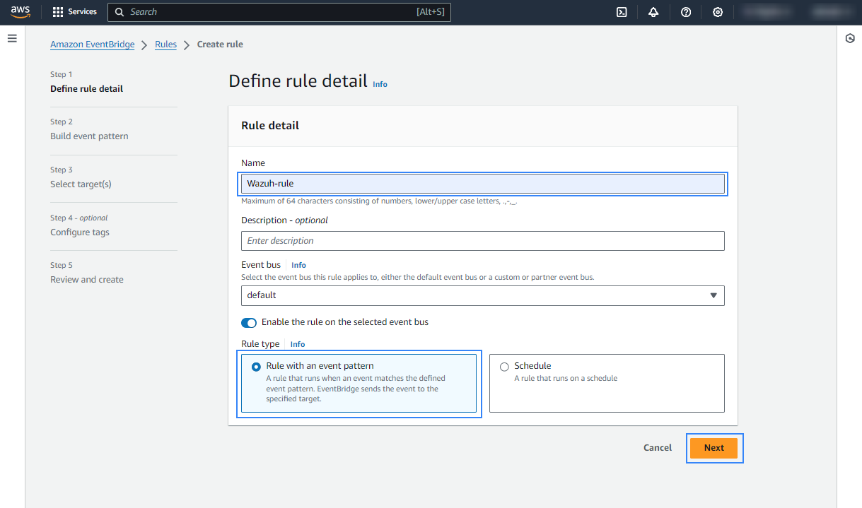 Give a name to the EventBridge rule and select the Rule with an event pattern option.