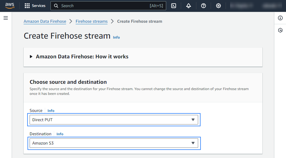 Select Direct PUT and Amazon S3 as the desired Source and Destination, respectively.