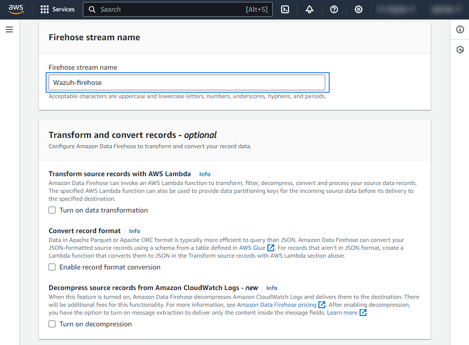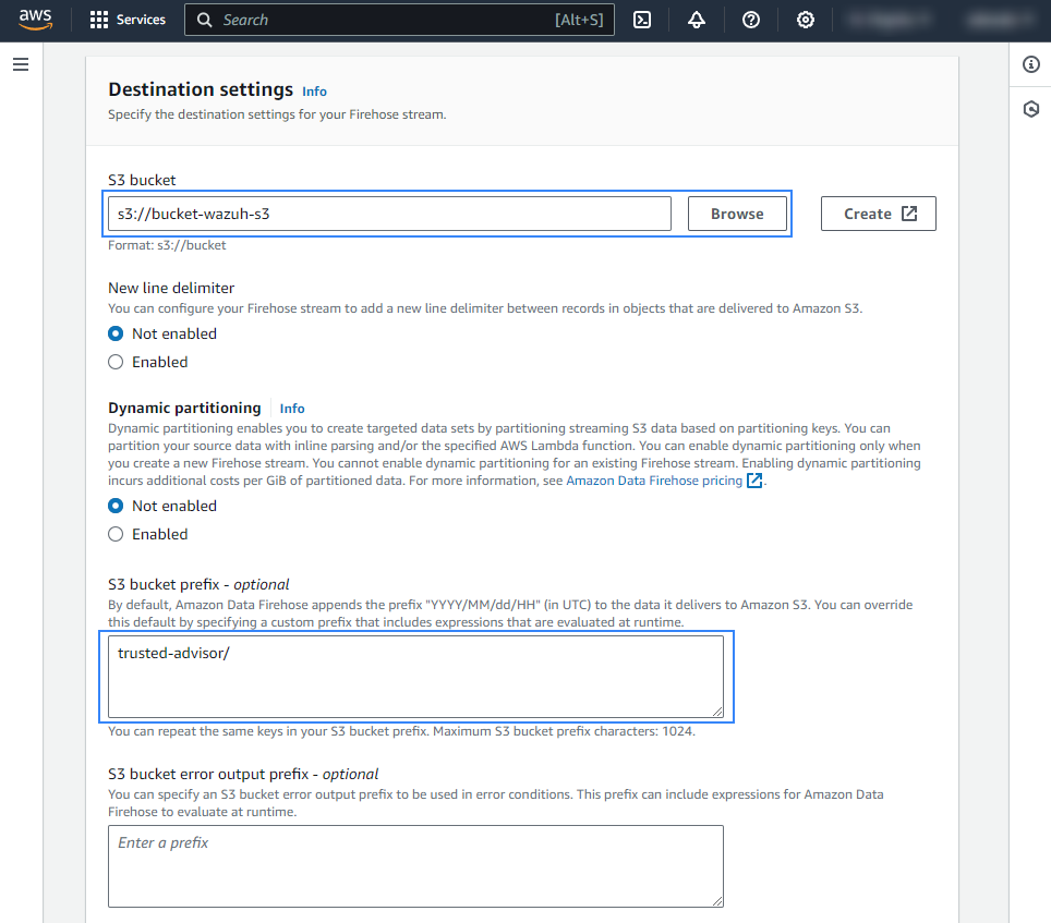 Create an Amazon Data Firehose delivery stream to store the Trusted Advisor logs into the desired S3 bucket so Wazuh can process them.