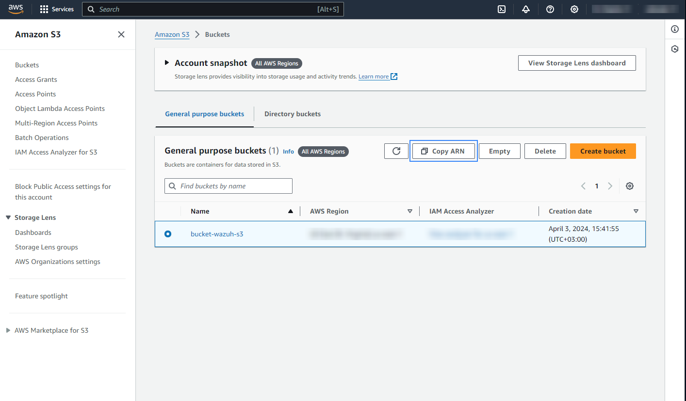 Go to S3 buckets, select an existing S3 bucket or create a new one, then copy the Amazon Resource Name (ARN) of the S3 bucket.