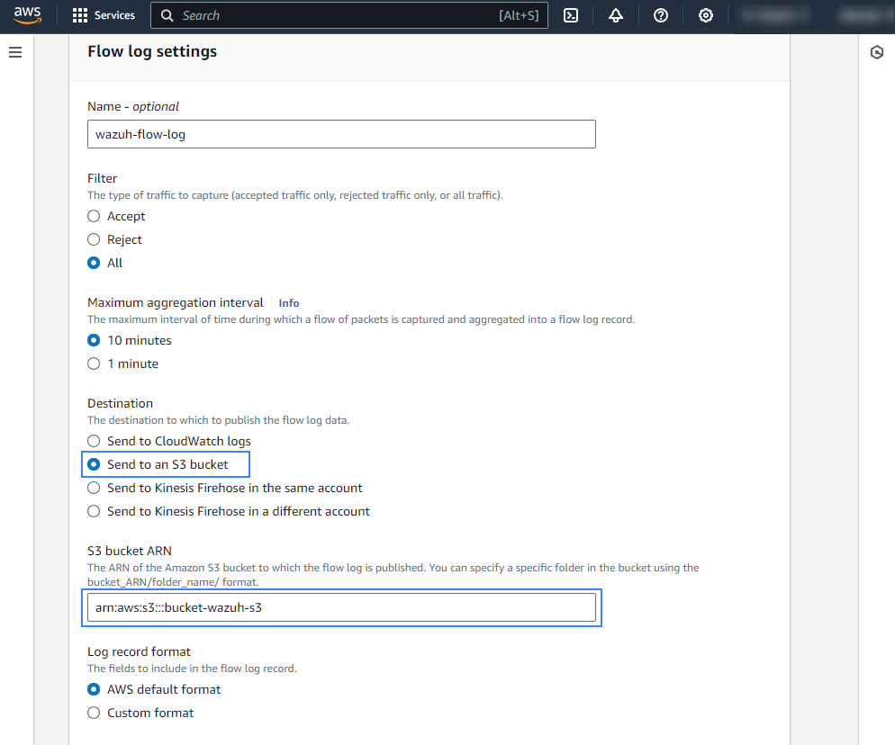 <WAZUH_AWS_BUCKET>with the name of the S3 bucket:<wodle name="aws-s3"> <disabled>no</disabled> <interval>10m</interval> <run_on_start>yes</run_on_start> <skip_on_error>yes</skip_on_error> <bucket type="vpcflow"> <name><WAZUH_AWS_BUCKET></name> <aws_profile>default</aws_profile> </bucket> </wodle>