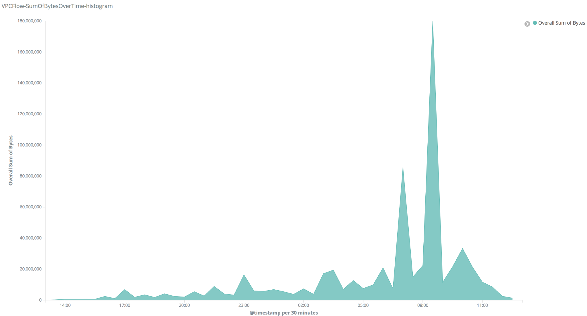 You can monitor your network with this visualization to identify peaks. Once a peak is identified, apply filters to view the alerts generated during that time and examine the communication between IP addresses. Since the IP address is a field in numerous AWS alerts, you may discover additional alerts and gain insights into the events that occurred.