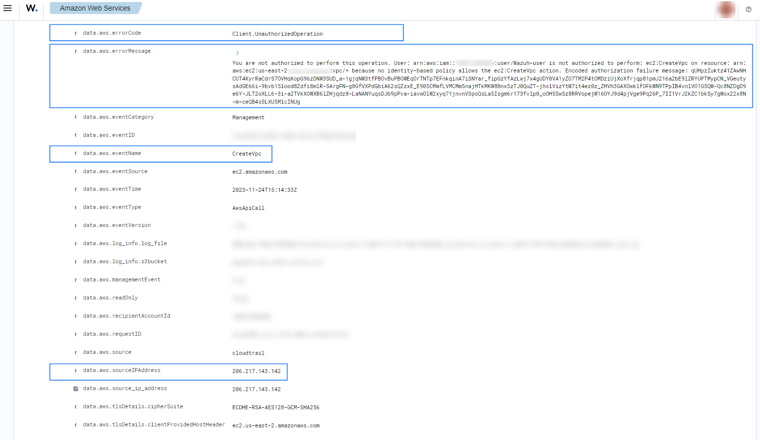 If a user without proper permissions attempts to create a VPC, the following alerts with rule ID 80203 will be shown on the Wazuh dashboard.