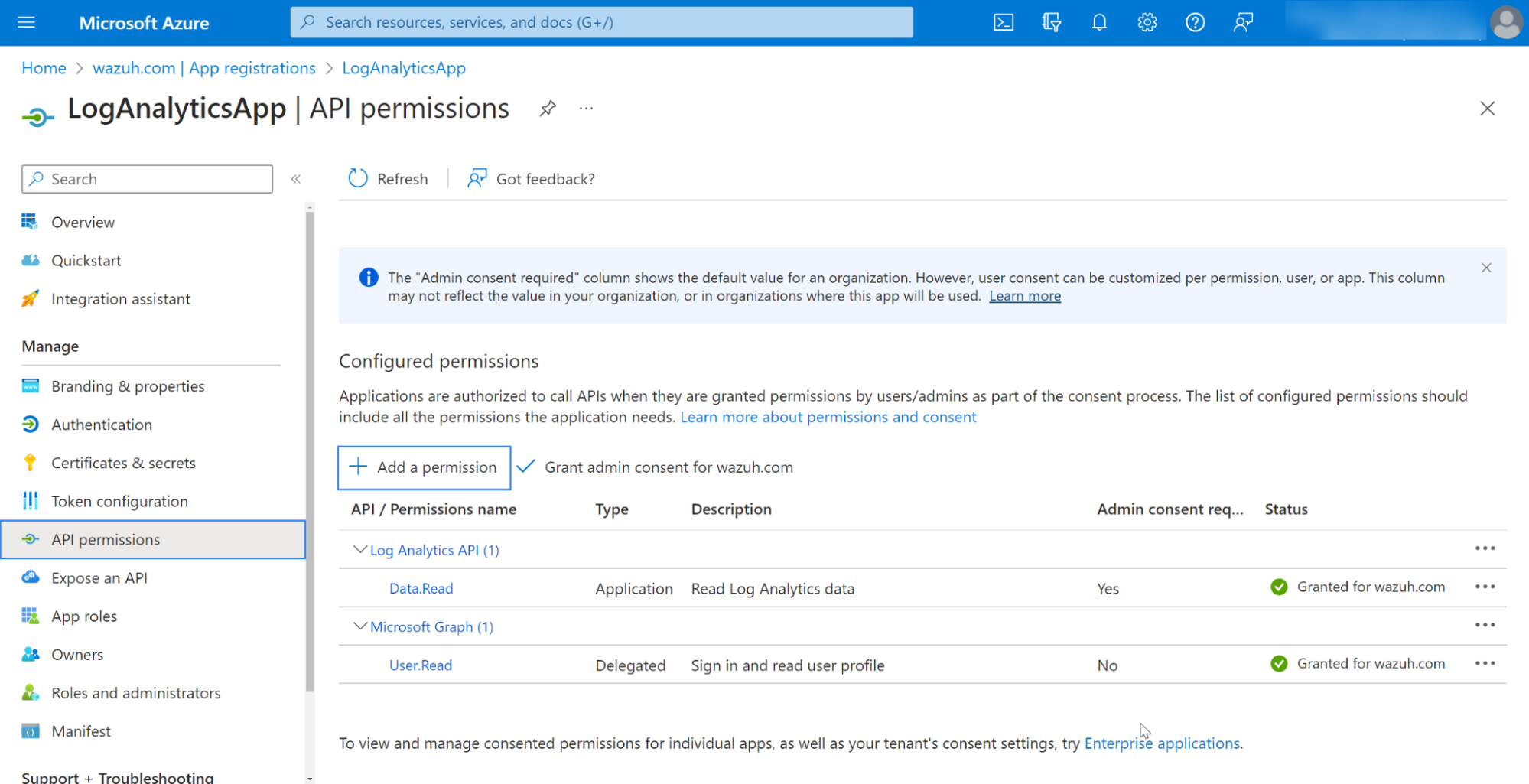 Wazuh requires valid credentials to pull logs from Azure Log Analytics. Look at the credentials section to learn how to generate a client secret to access the App registration.
