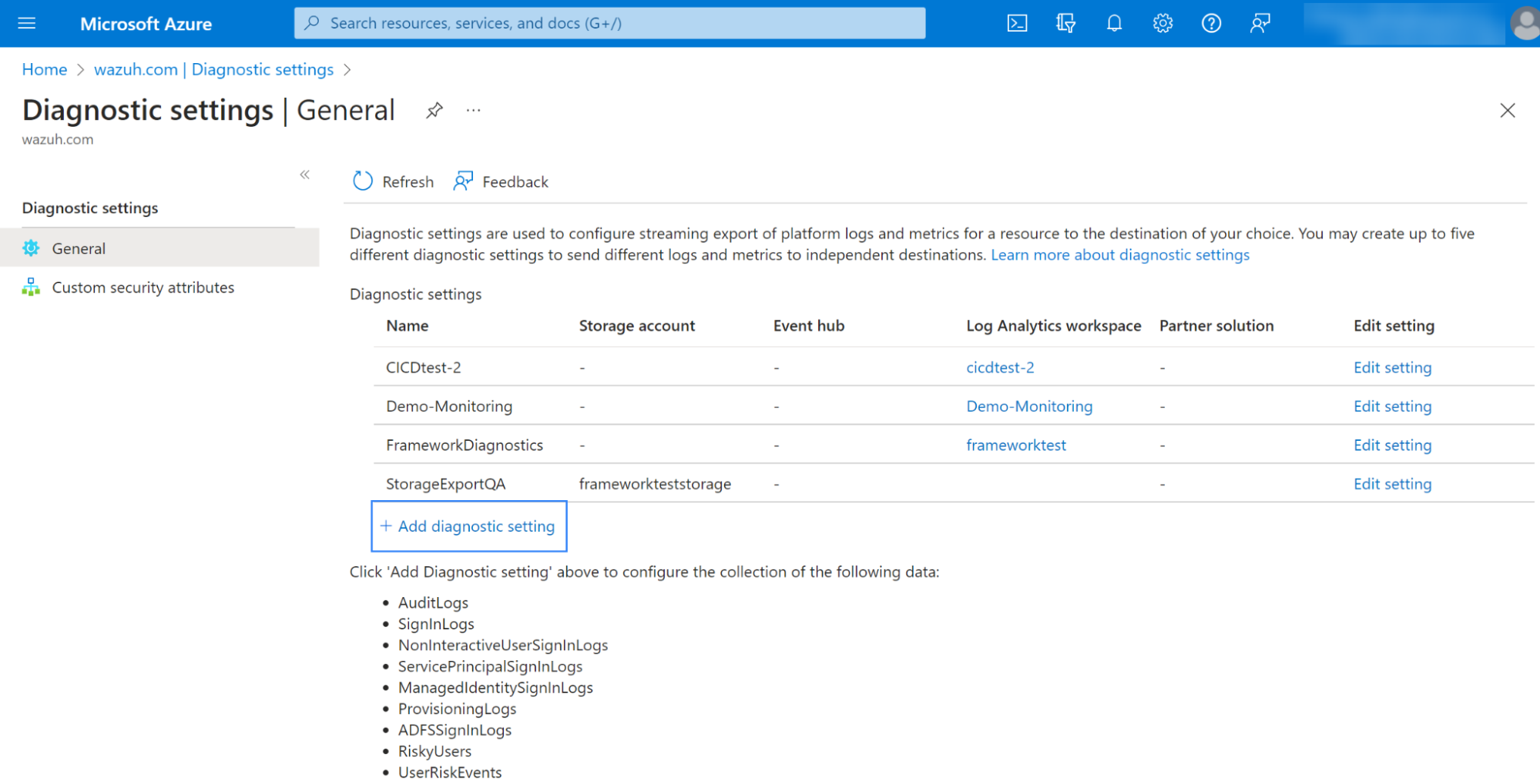 2. Click on Add diagnostic setting.