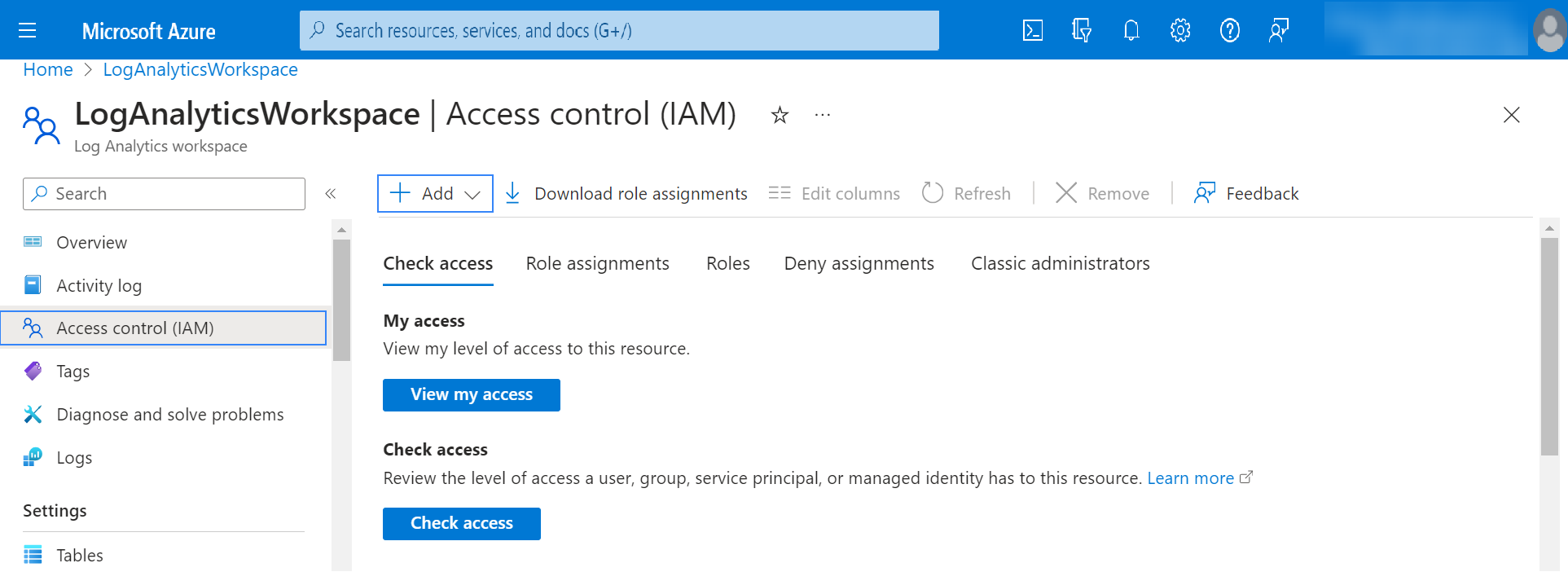 3. Go to the Access control (IAM) section, click Add and select Add role assignment to add the required role to the application.