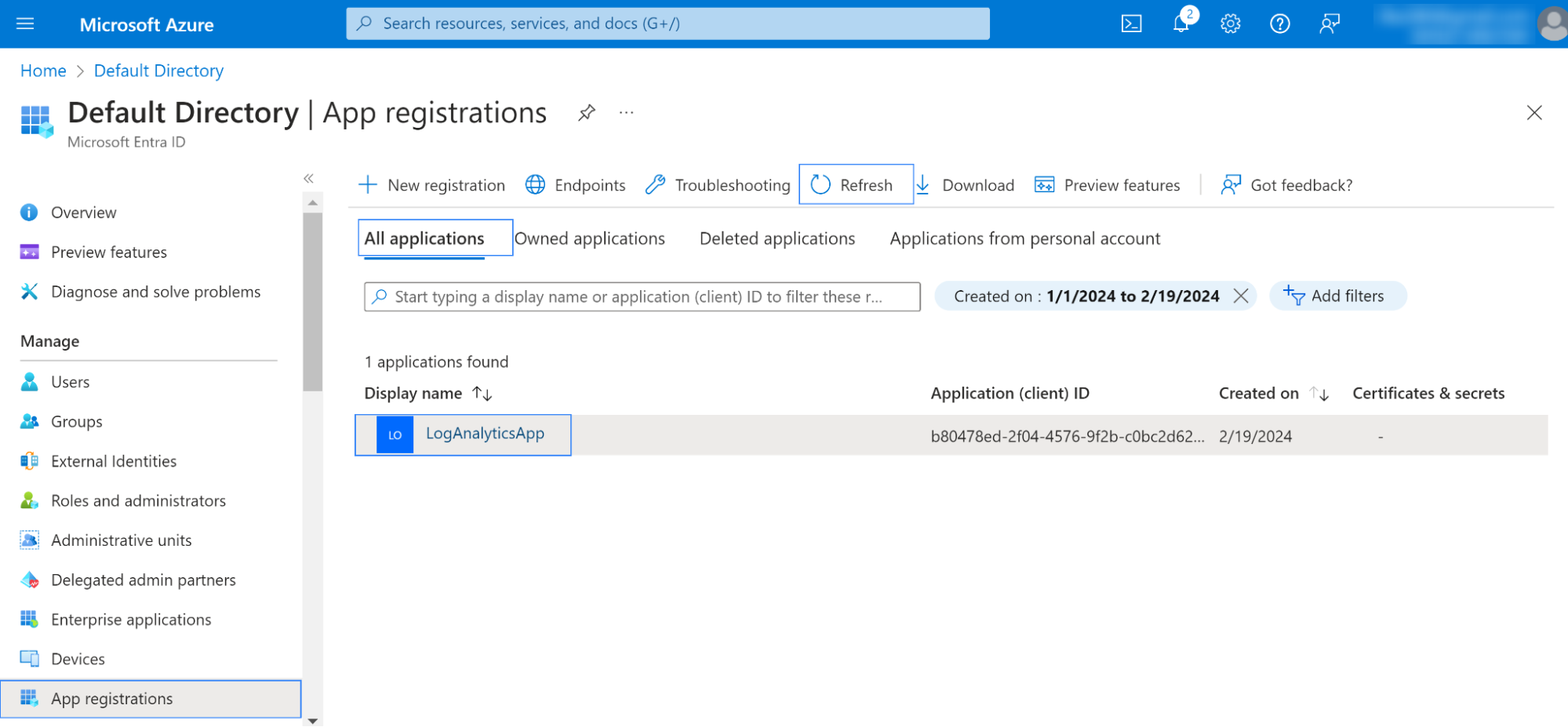 1. Select All applications from App registration and refresh it. The new application will appear. In our case, the display name is LogAnalyticsApp.