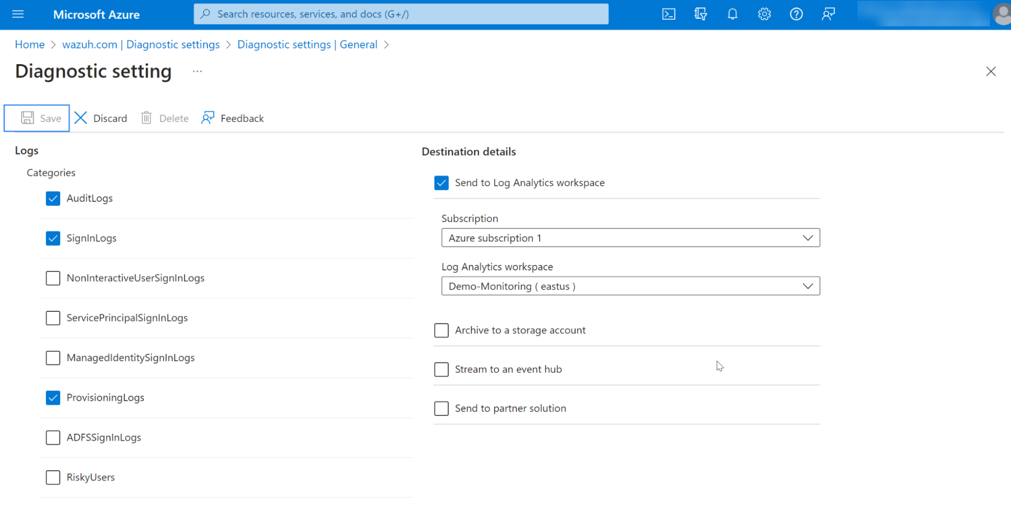 Azure Log Analytics will stream the selected categories to your workspace.