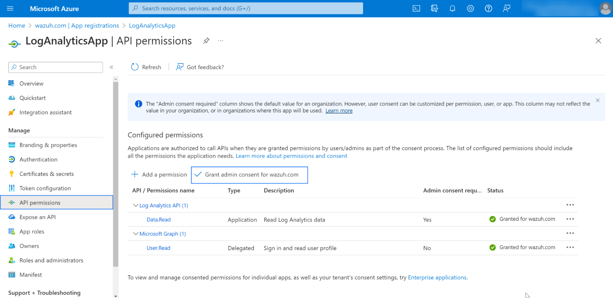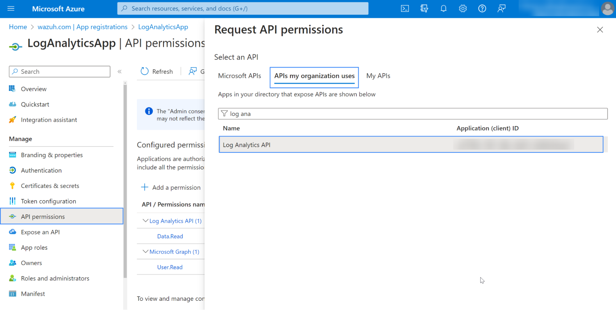 Granting the application access to the Azure Log Analytics API