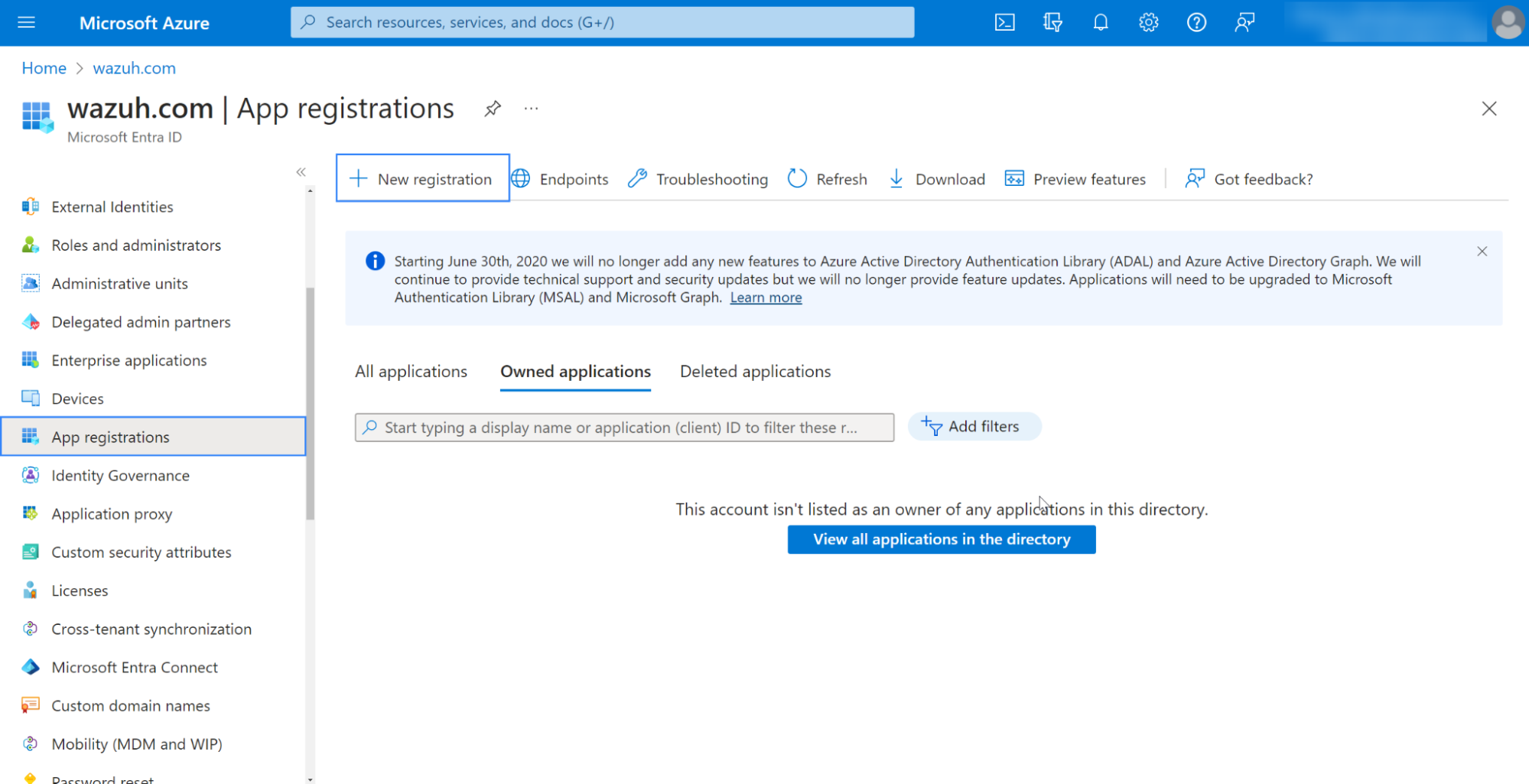 1. Select the App registrations option from the Microsoft Entra ID panel. Then, select New registration.