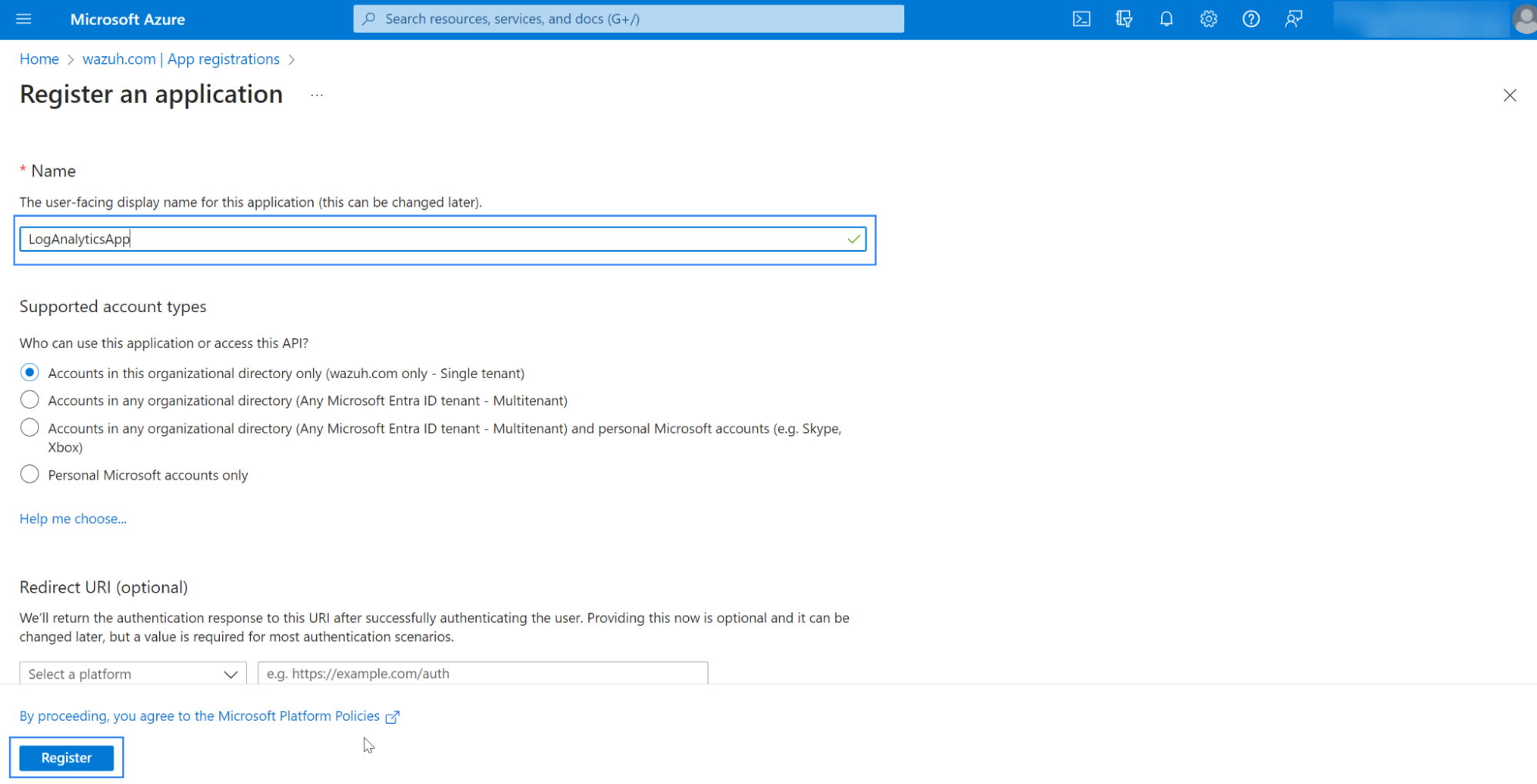 We navigate to the Microsoft Entra ID panel on the Microsoft Azure portal to create a new application for Azure Log Analytics.