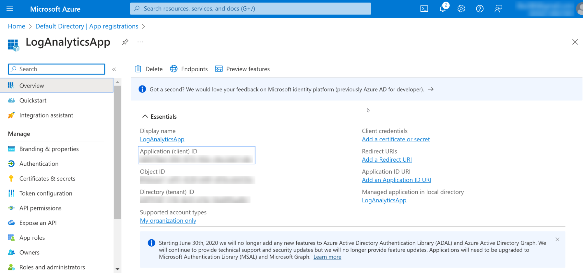The process below details creating an application using the Azure Log Analytics REST API. It is also possible to configure an existing application. Please skip the Creating the application step if you already have an existing application.