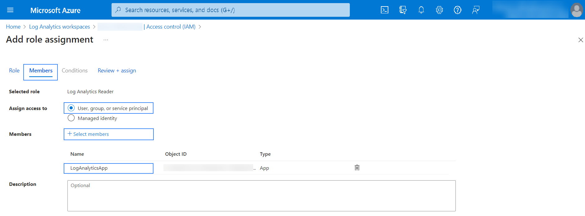 5. Select User, group, or service principal from the Members tab. Click Select members and find the App registration created previously.