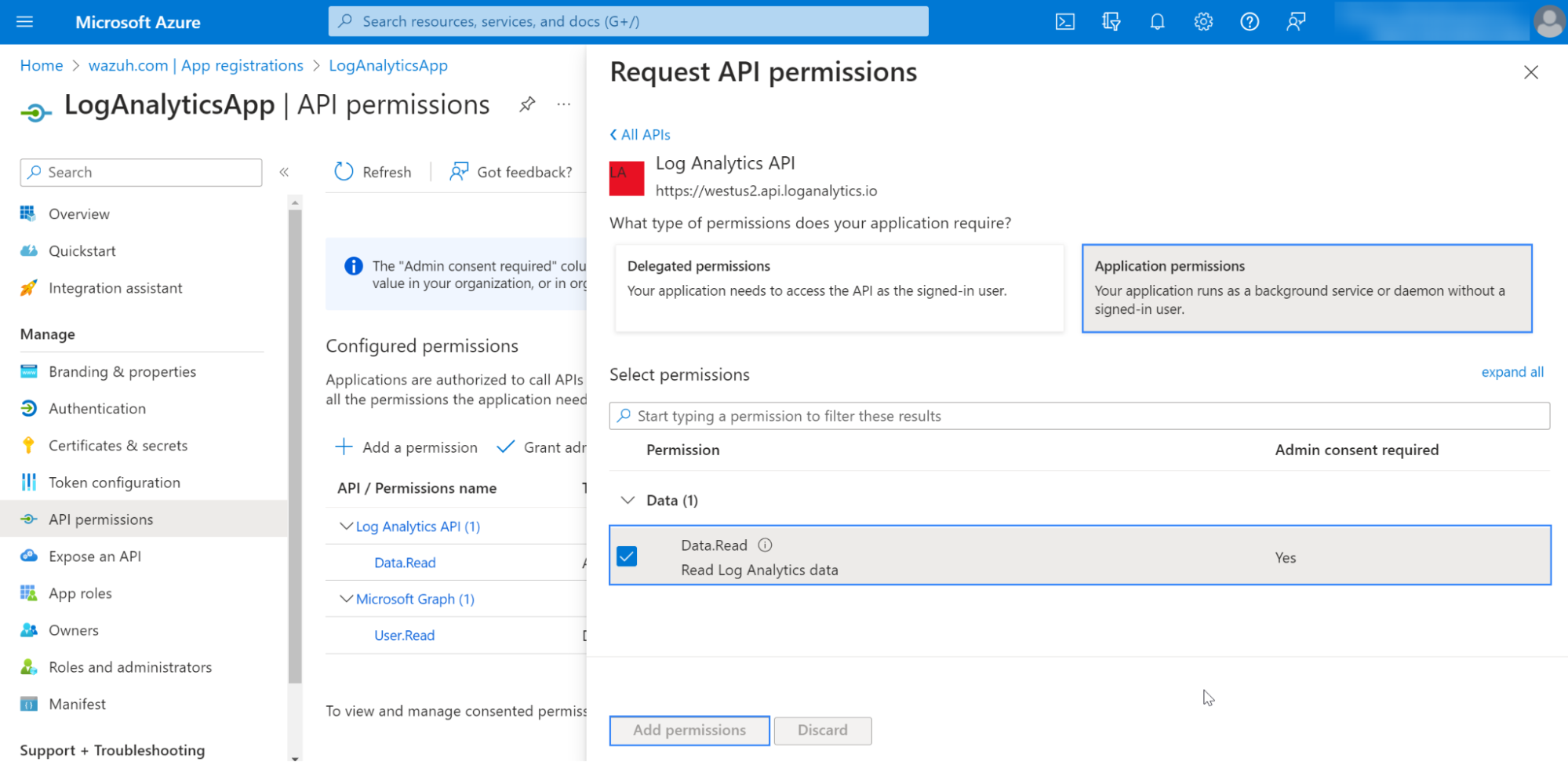 5. Select the Read Log Analytics data permission from Applications permissions.