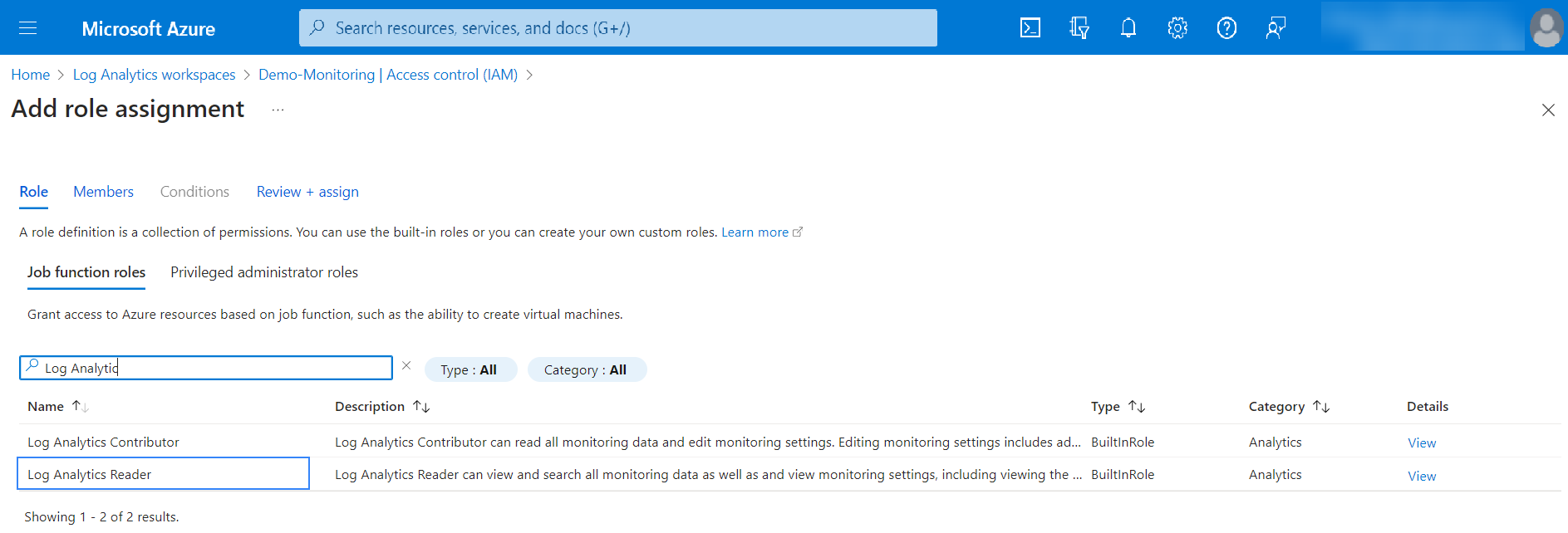 4. Select the Log Analytics Reader role from the Job functions role tab.