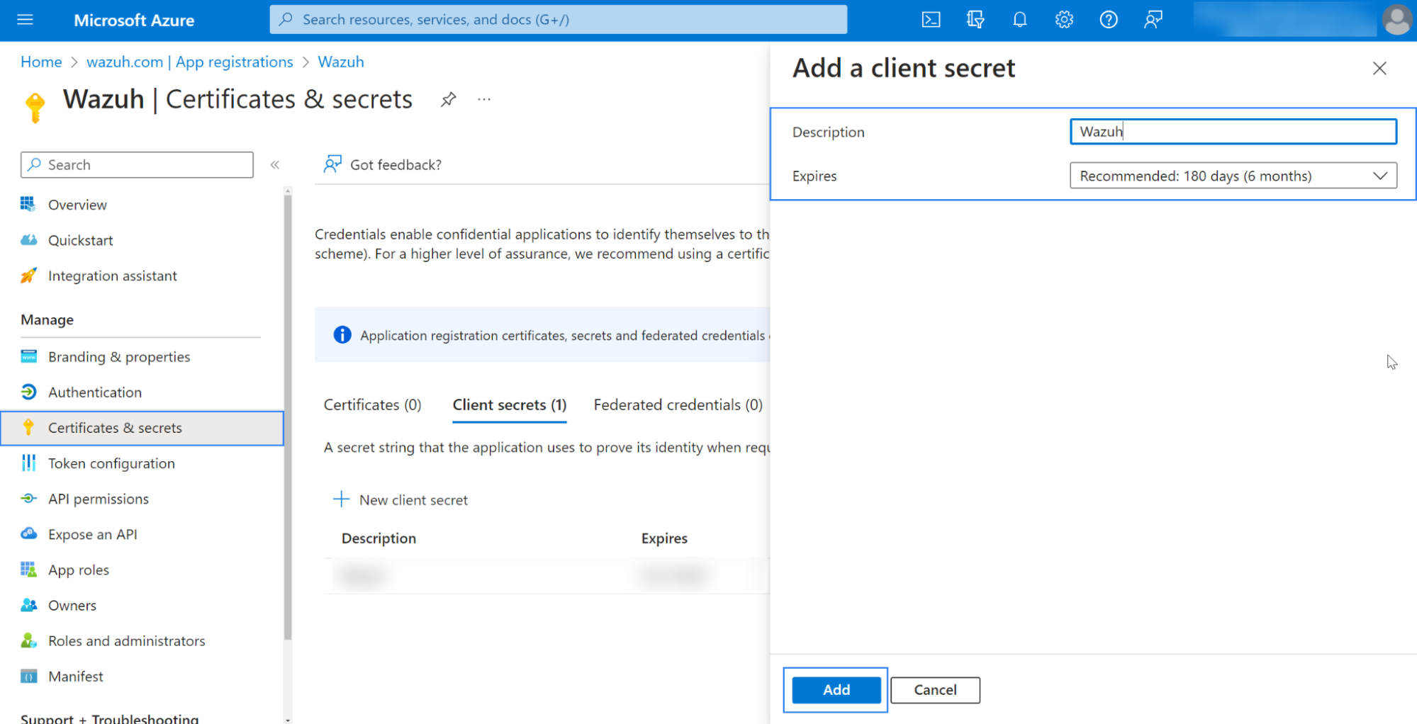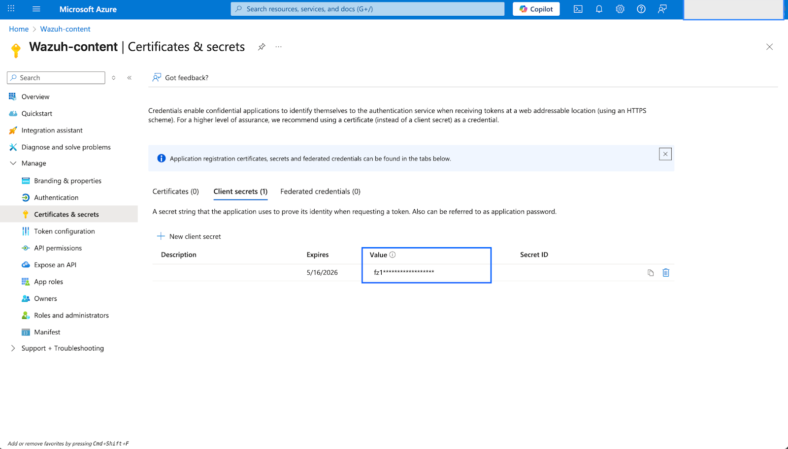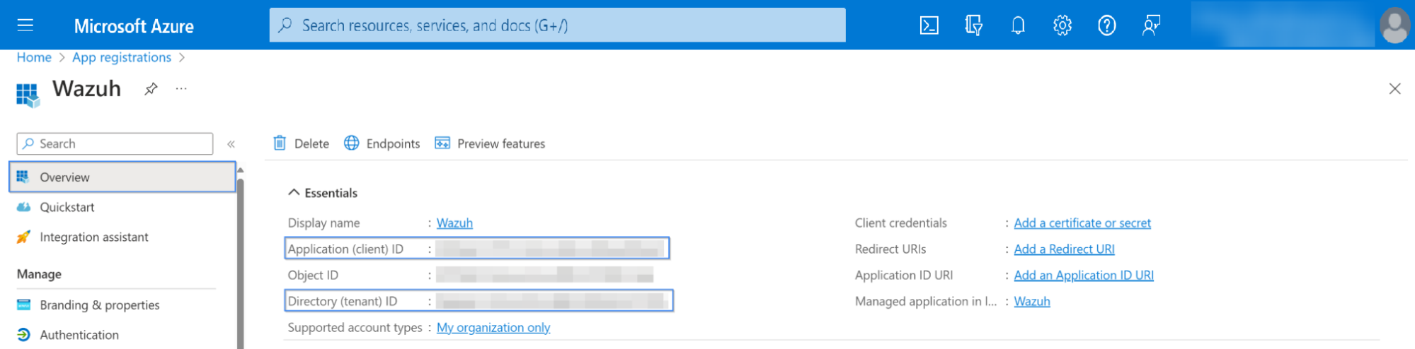 Wazuh must be authorized before it can pull logs and other content from the Microsoft Graph API. This authentication process is possible using the tenant_id, client_id, and secret_value of an authorized application, which we will register through Azure.