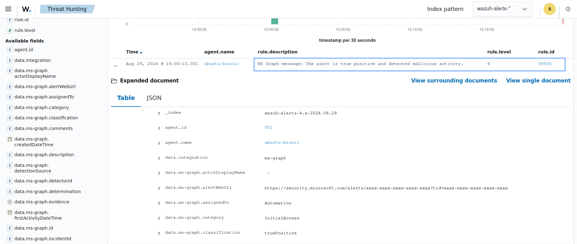 Once Wazuh connects with the Microsoft Graph API, the previous log triggers the rule and raises the following Wazuh alert:
