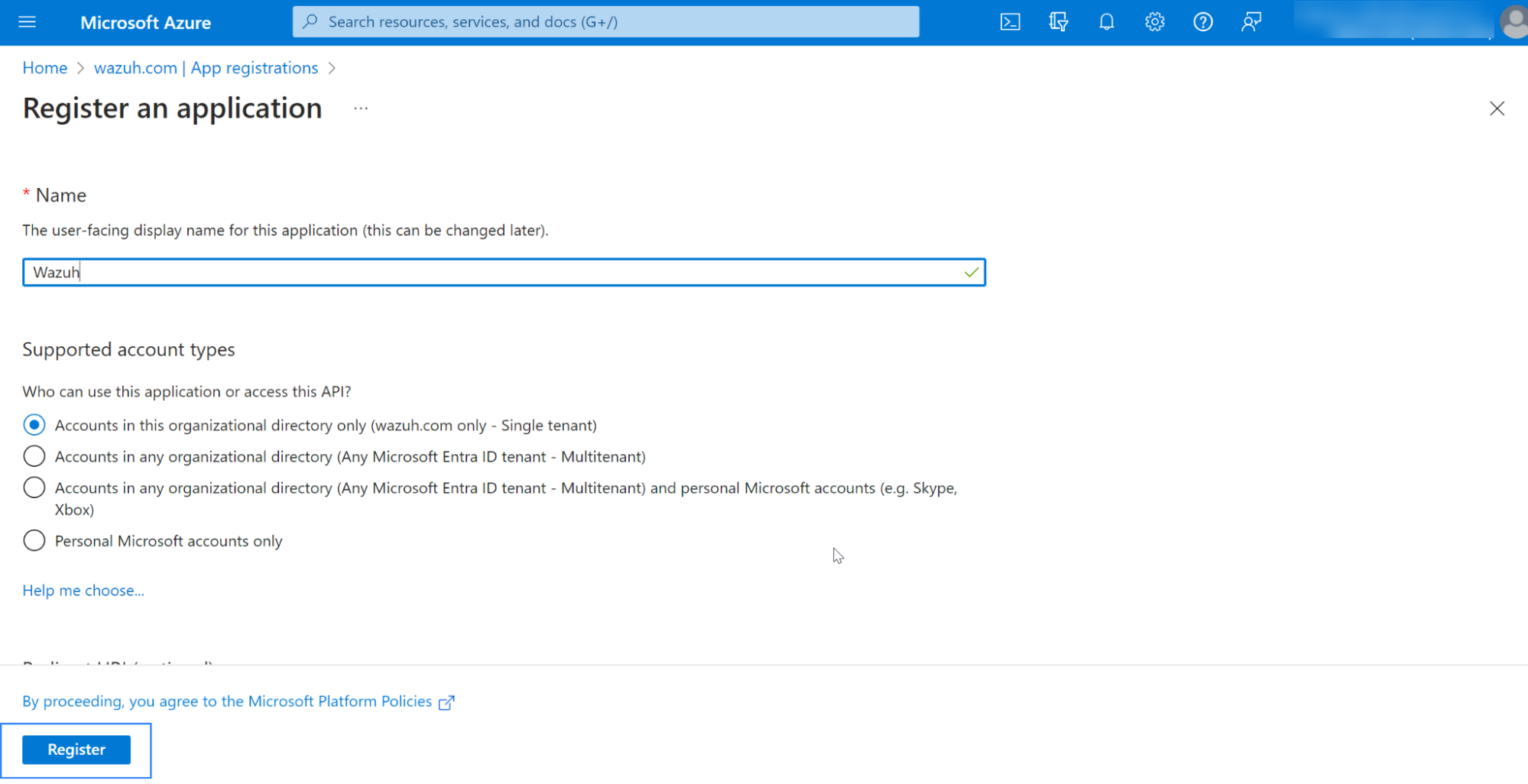Fill in the name of your app, choose the desired account type, and click on the Register button: