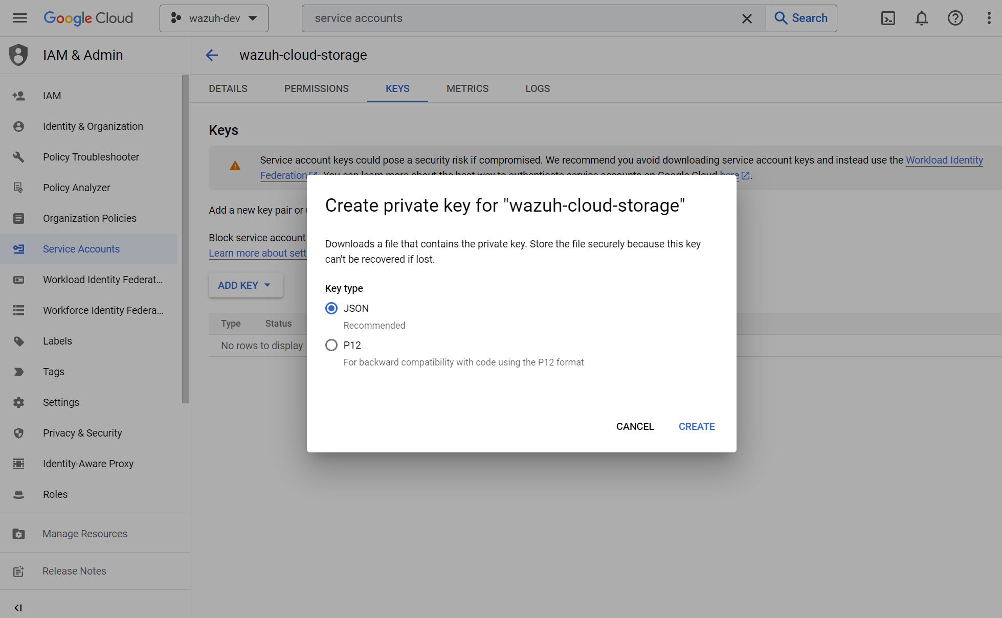 A credentials file is required by the Wazuh Google Cloud modules to access the Google Cloud Pub/Sub or Google Cloud Storage bucket services. You must add a new private key after creating a service account on Google Cloud. The private key, project ID, and other information are stored in a credentials file created on Google Cloud. The credential file is in JSON format.