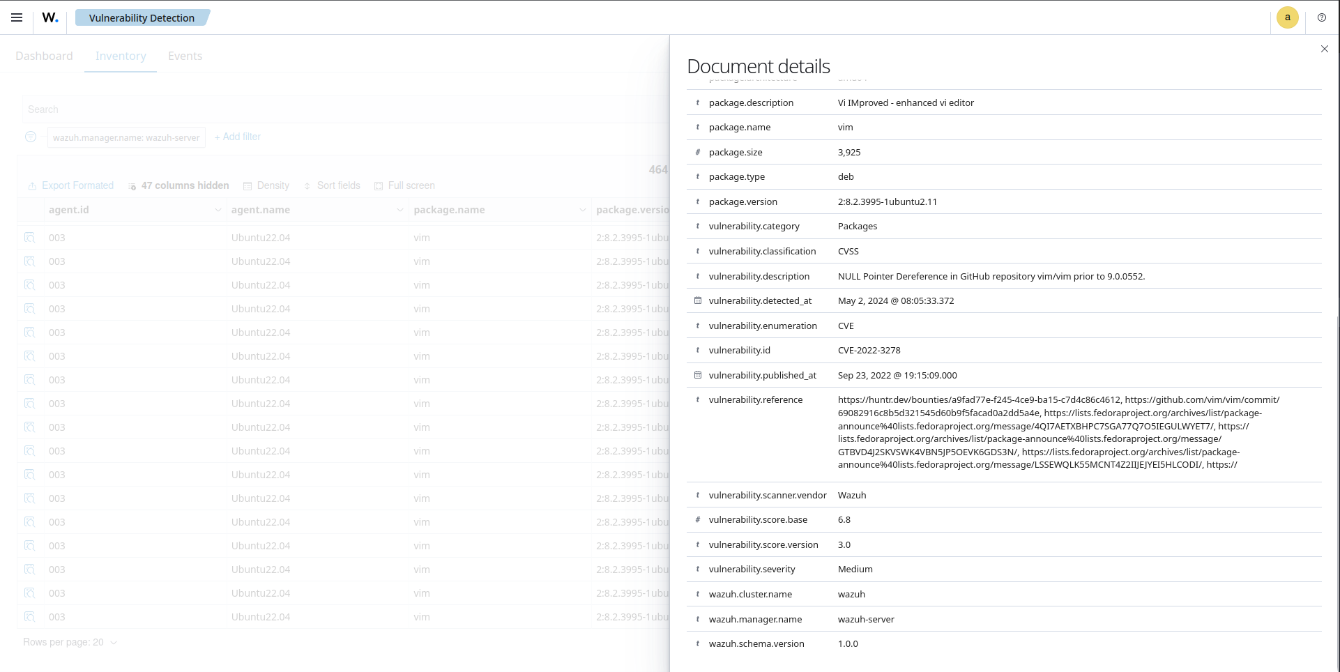 You can view the results on the Wazuh dashboard, which includes information about vulnerable packages on the monitored endpoint. In this case, the vim software installed on the endpoint has vulnerabilities.