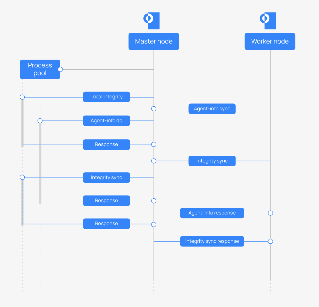 The integrity thread is responsible for synchronizing integrity data between the Wazuh server master node and all worker nodes. The synchronization process is initiated by the worker node and occurs in the following stages: