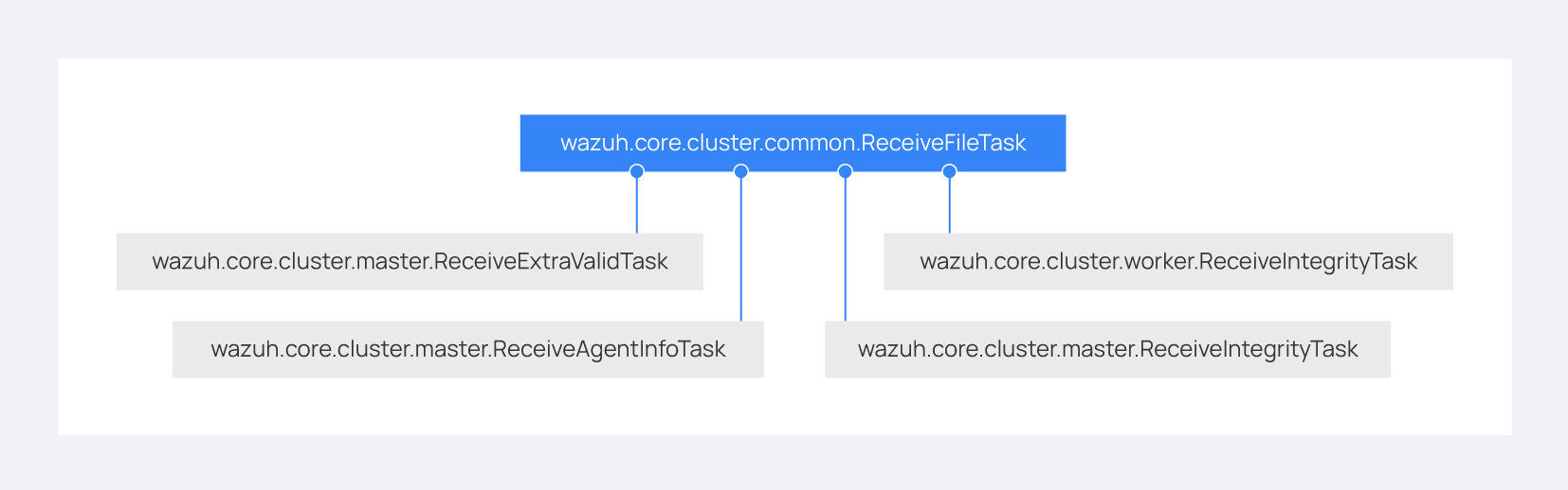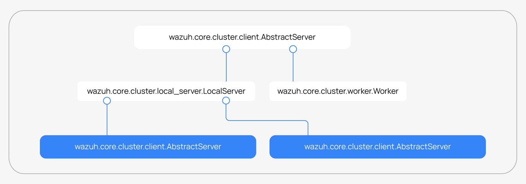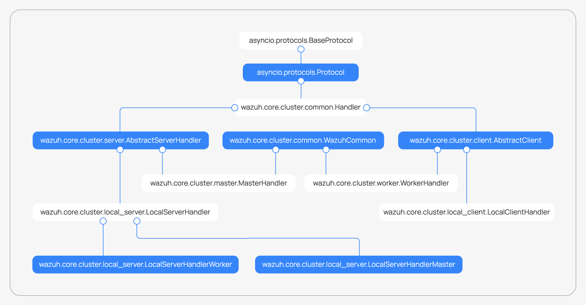 Each of the threads described in the Workflow section are implemented as asynchronous tasks. These tasks are started in wazuh.core.cluster.client.AbstractClientManager.start, wazuh.core.cluster.server.AbstractServer.start, and wazuh.core.cluster.local_server.LocalServer.start and they are all implemented using infinite loops.