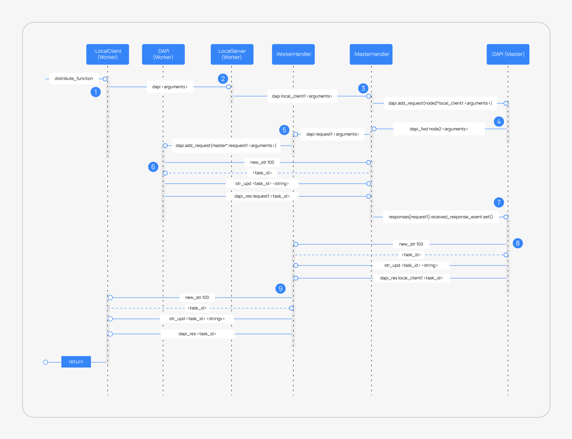 dapi_rescommand. Thetask_idis necessary since the master can receive multiple long strings at the same time and it needs a way to identify each one.7: Once the master node receives the required information from the worker node, it is able to solve the originally received request from the worker node. The master node notifies the distributed API that the response has already been received.