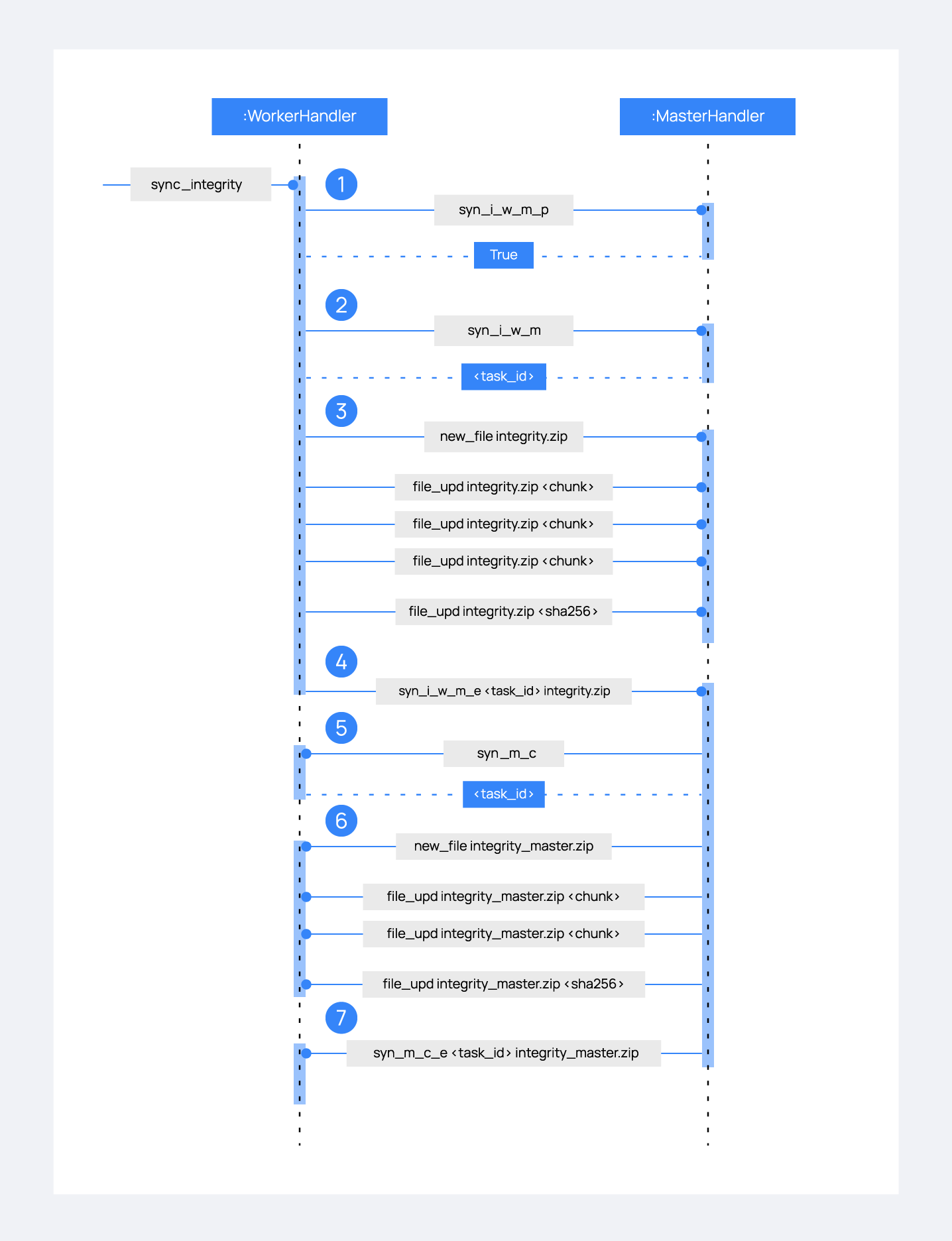 syn_m_ccommand. The worker creates a task to process the integrity received from the master, but the task is sleeping since it has not been received yet. This is the same process the worker has done with the master but changing directions.6: The master sends all information to the worker through the sending file process.