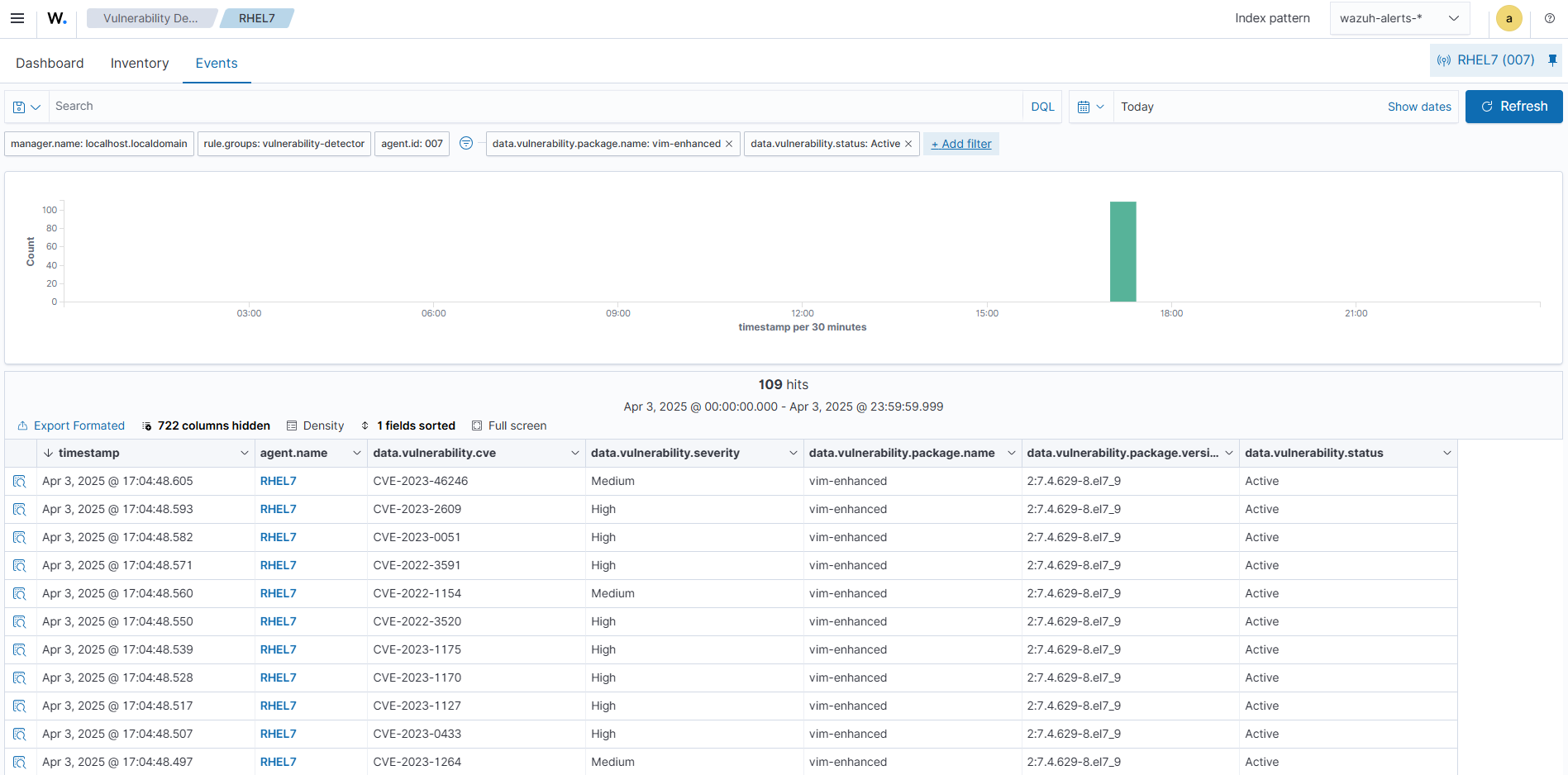 To see vulnerability alerts from the last system inventory scan, switch to the Events tab. Add filters in the search bar to query vulnerability alerts for Vim.