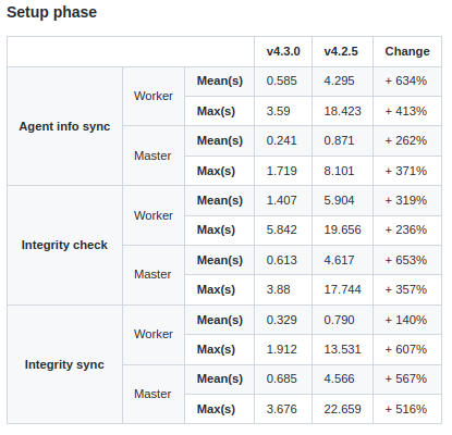 Wazuh v4.3.0 brings significant changes to the cluster, which now uses multiple processes to improve the performance. The results in the table below show a significant improvement for the cluster in this new version. The cluster tasks are performed 423% faster than in the previous version, approximately five times faster, while the RAM consumption decreased to a third. This performance is especially appreciable during the setup phase, where the cluster load is at its highest.