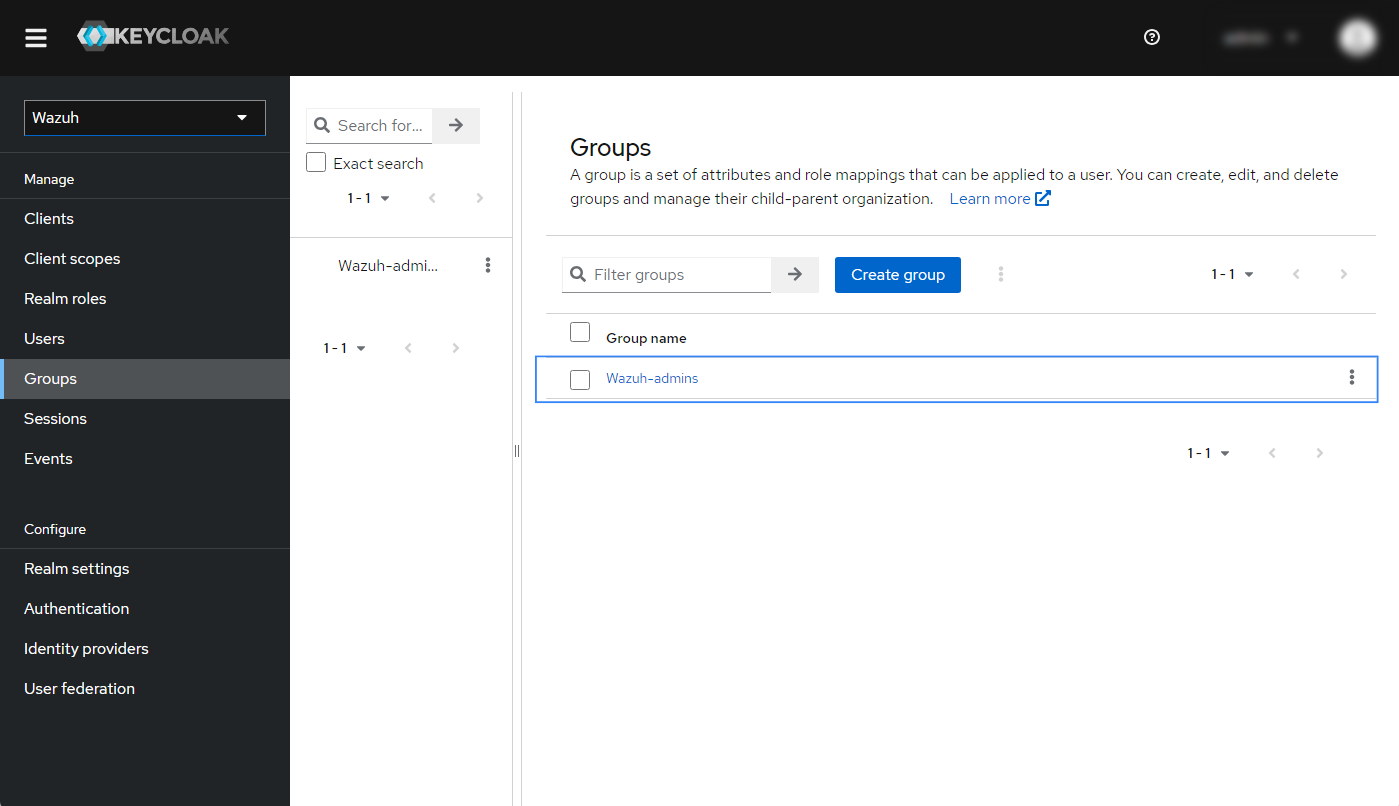 Go to Groups > Create group and assign a name to the group. In our case, this is Wazuh-admins.