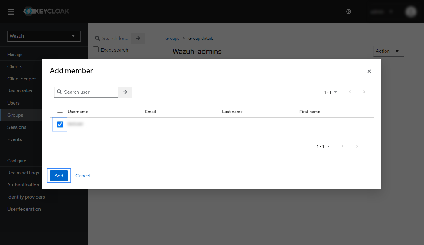 Click on the newly created group, navigate to Members > Add member and select the user created in the previous step. Click on Add to add it to the group.