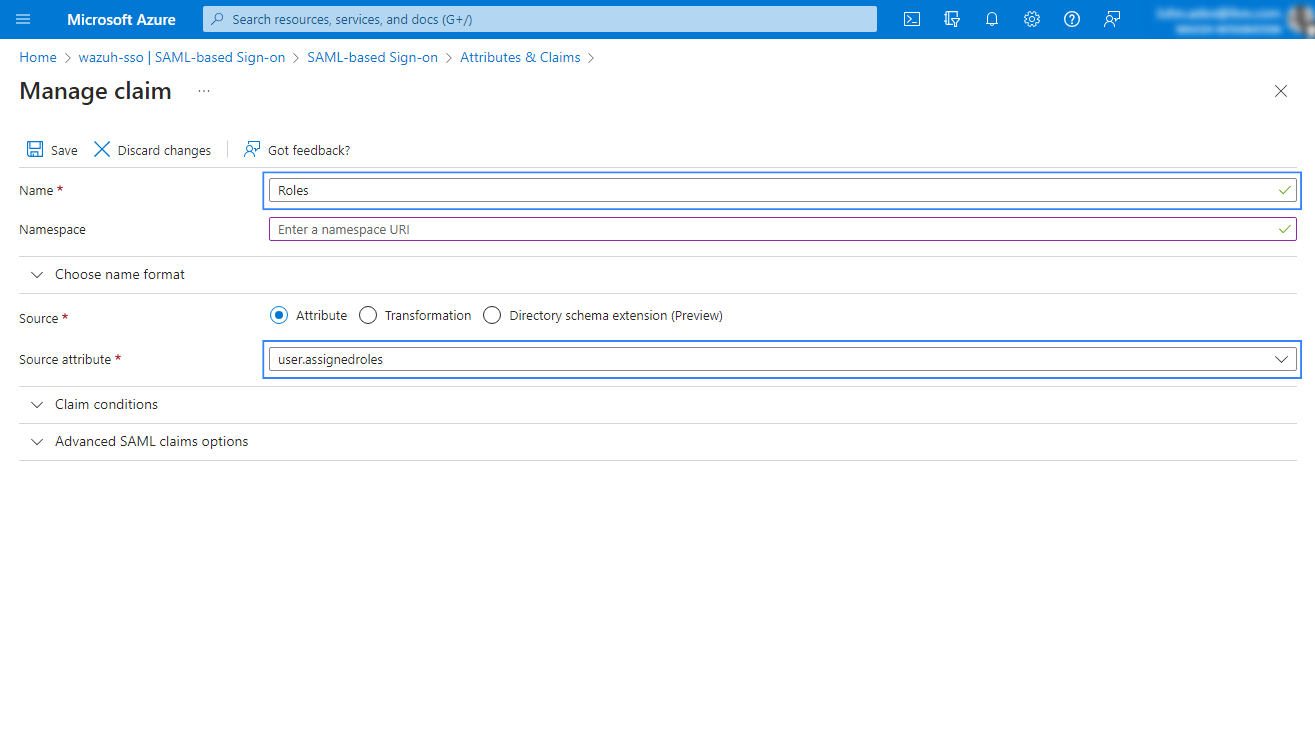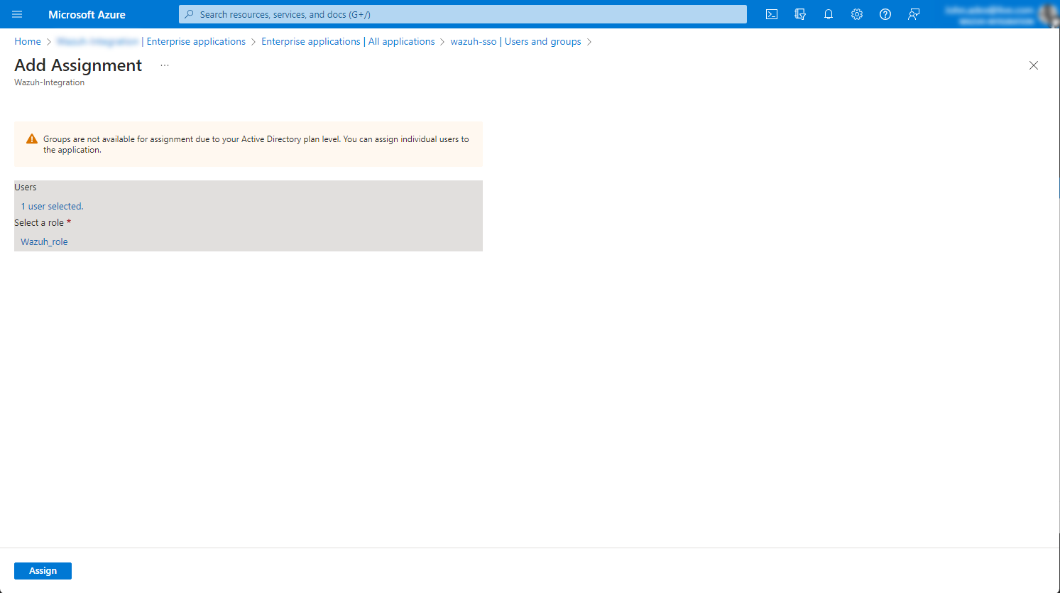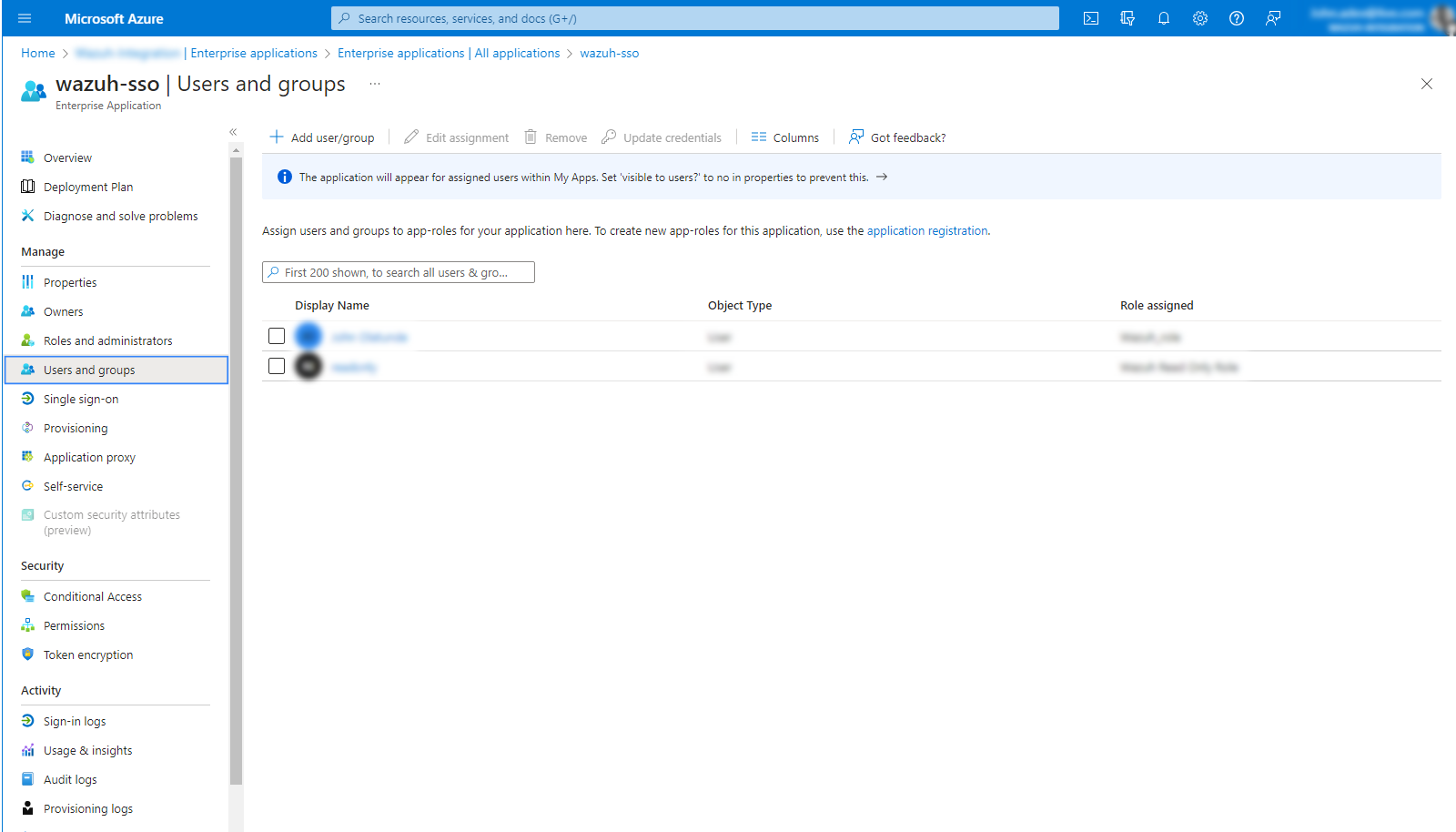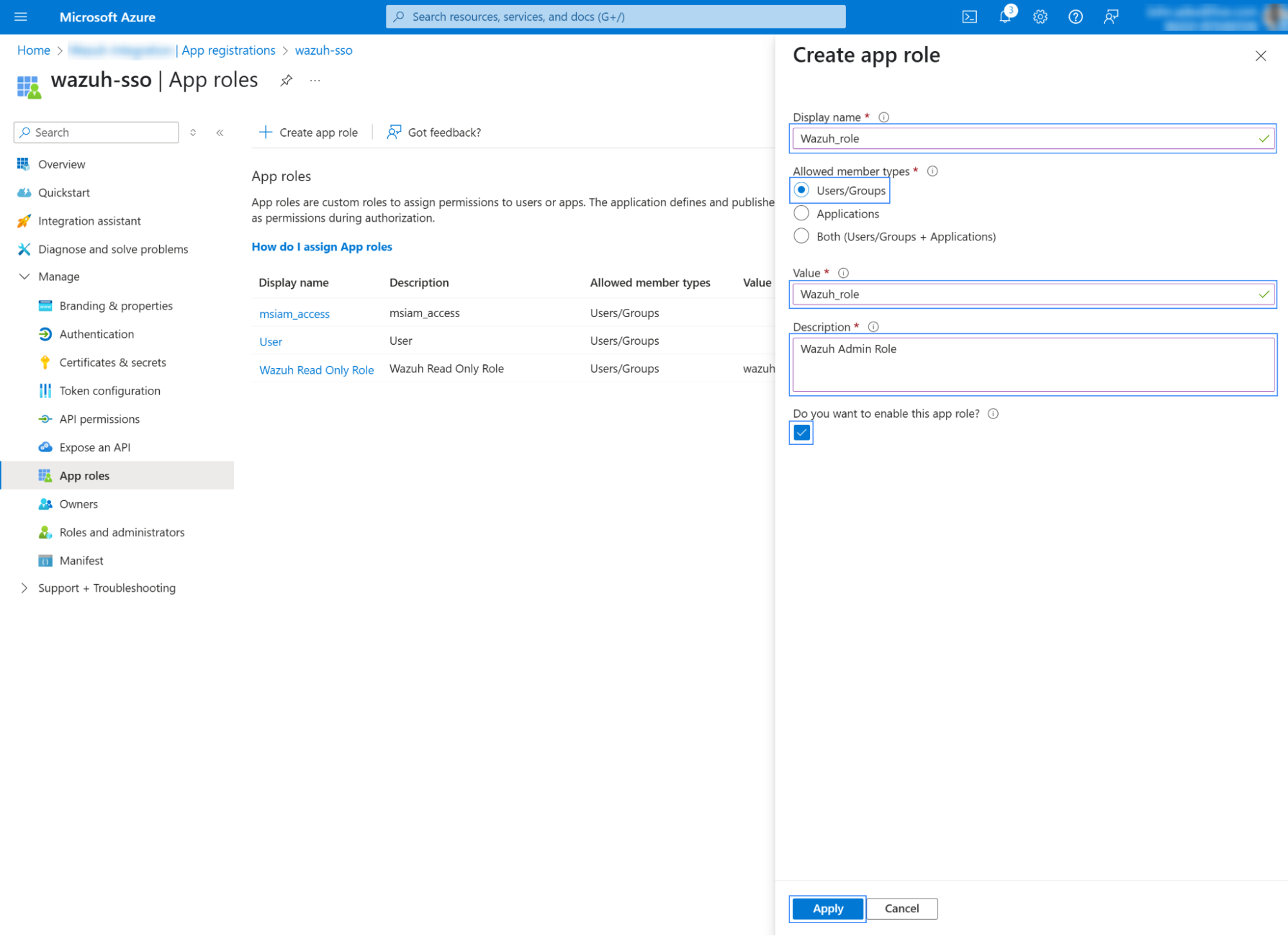 roles_mapping.ymlfile to map the role we have in Microsoft Entra ID to the appropriate Wazuh indexer role. In this case, we map theWazuh_rolein Microsoft Entra ID to theall_accessrole in Wazuh indexer:all_access: reserved: false hidden: false backend_roles: - "admin" - "Wazuh_role" description: "Maps admin to all_access"