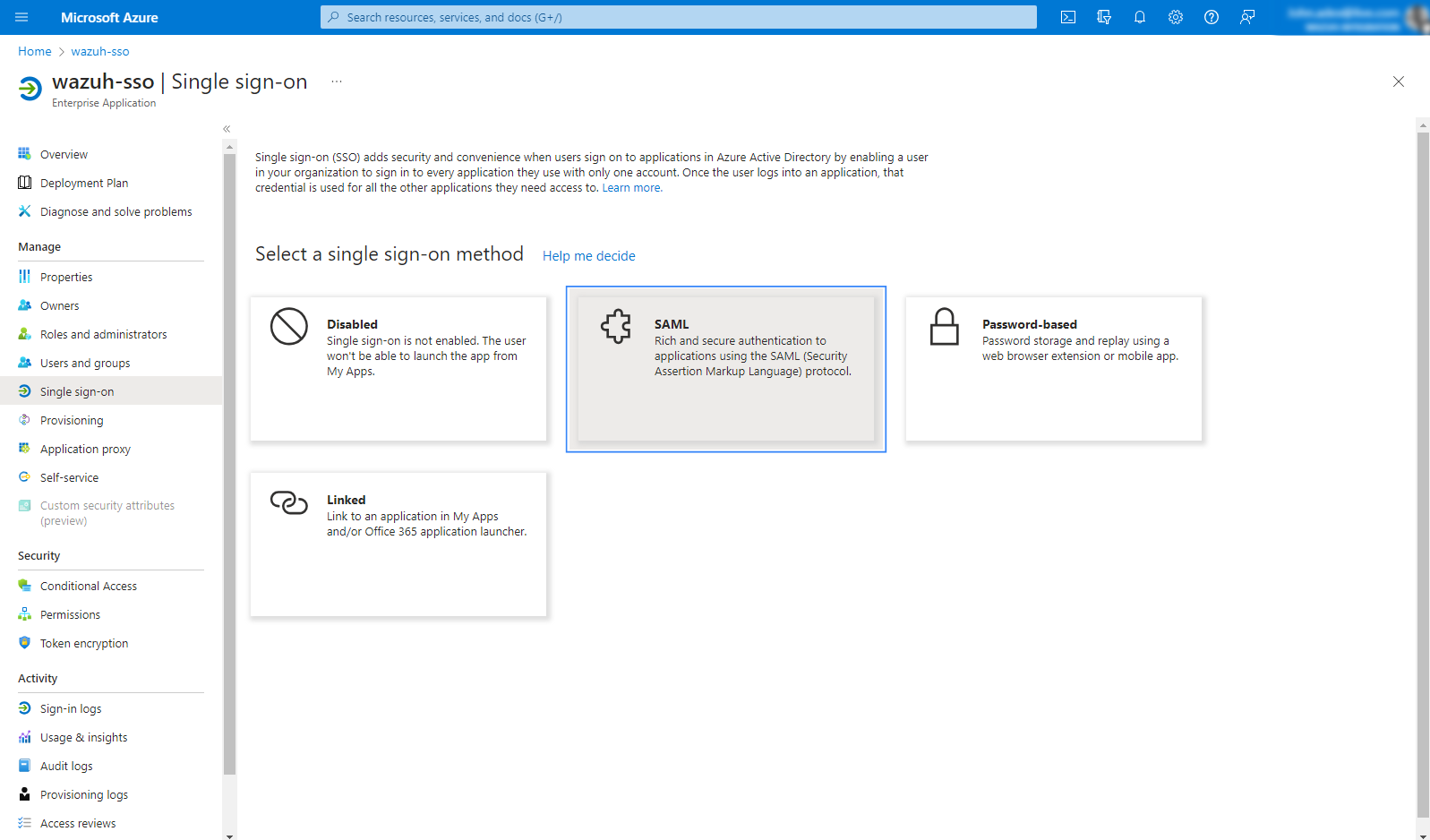 Note the necessary parameters. In the Enterprise applications menu, select your application and then click on Single sign-on. Note some parameters that will be used in the Wazuh indexer configuration.
