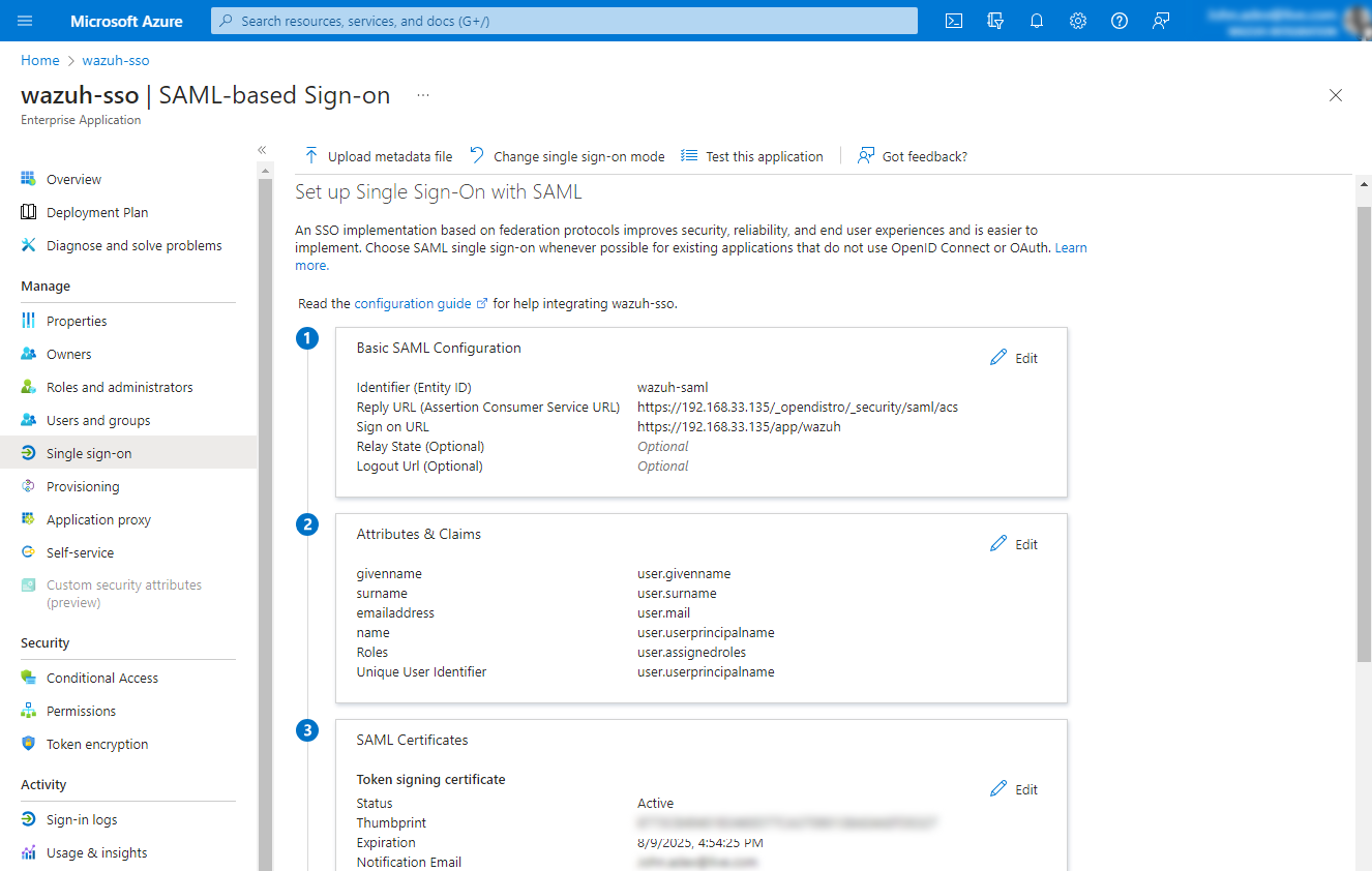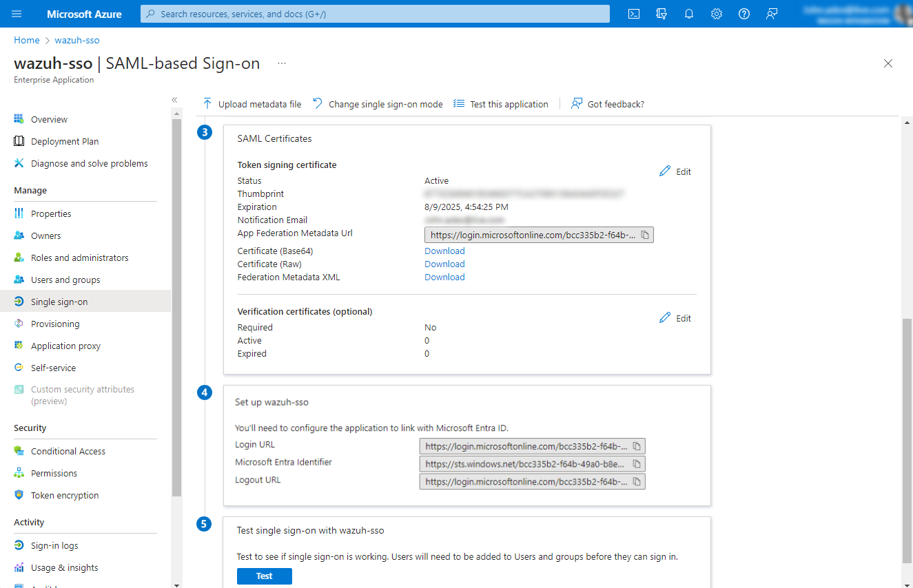 idp.metadata_urlin the Wazuh indexer configuration file.In option 4 Set up <YOUR APPLICATION>, the Microsoft Entra ID Identifier will be our
