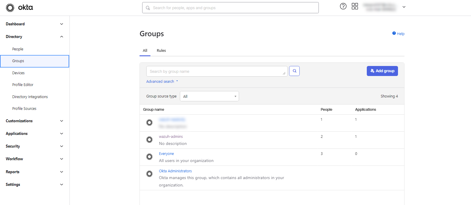 Create a new group. Navigate to Directory > Groups and add a group.