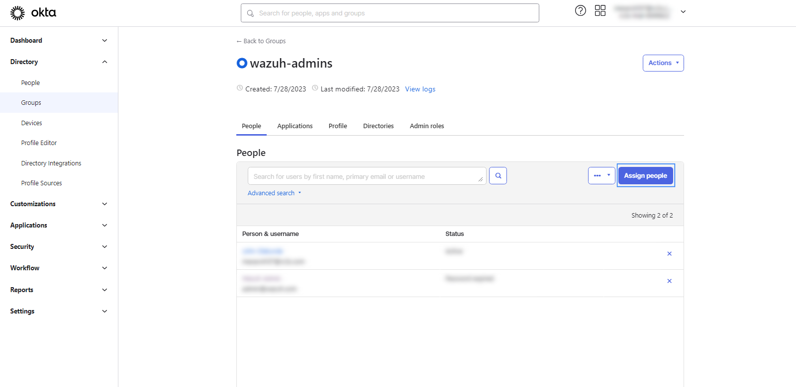 wazuh-admins. This name will be used as ourbackend_rolesinroles_mapping.yml.Add the new user to the new group. Navigate to Directory > Groups and select your group. Click on Assign People and add the user to the group created.