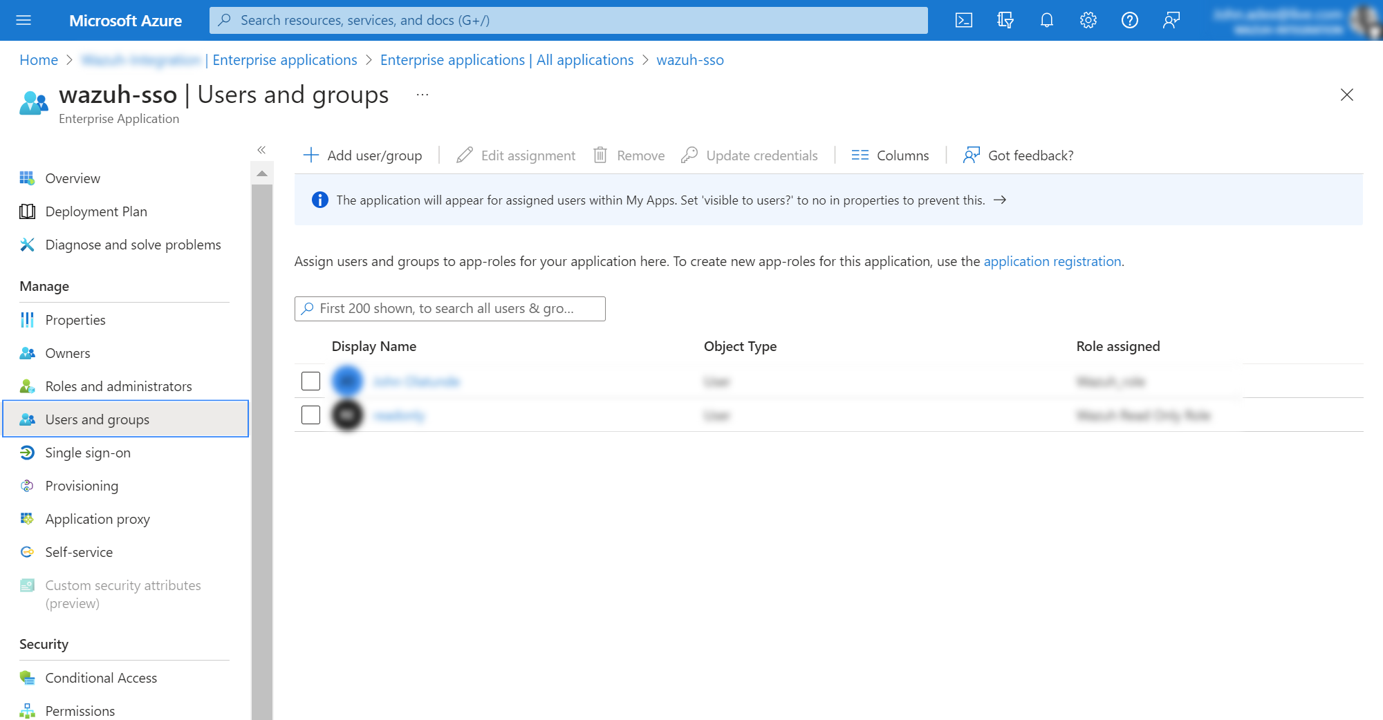 Click on Add user/group, assign a user and select the role we created in App roles. Click on Assign to save the configuration.